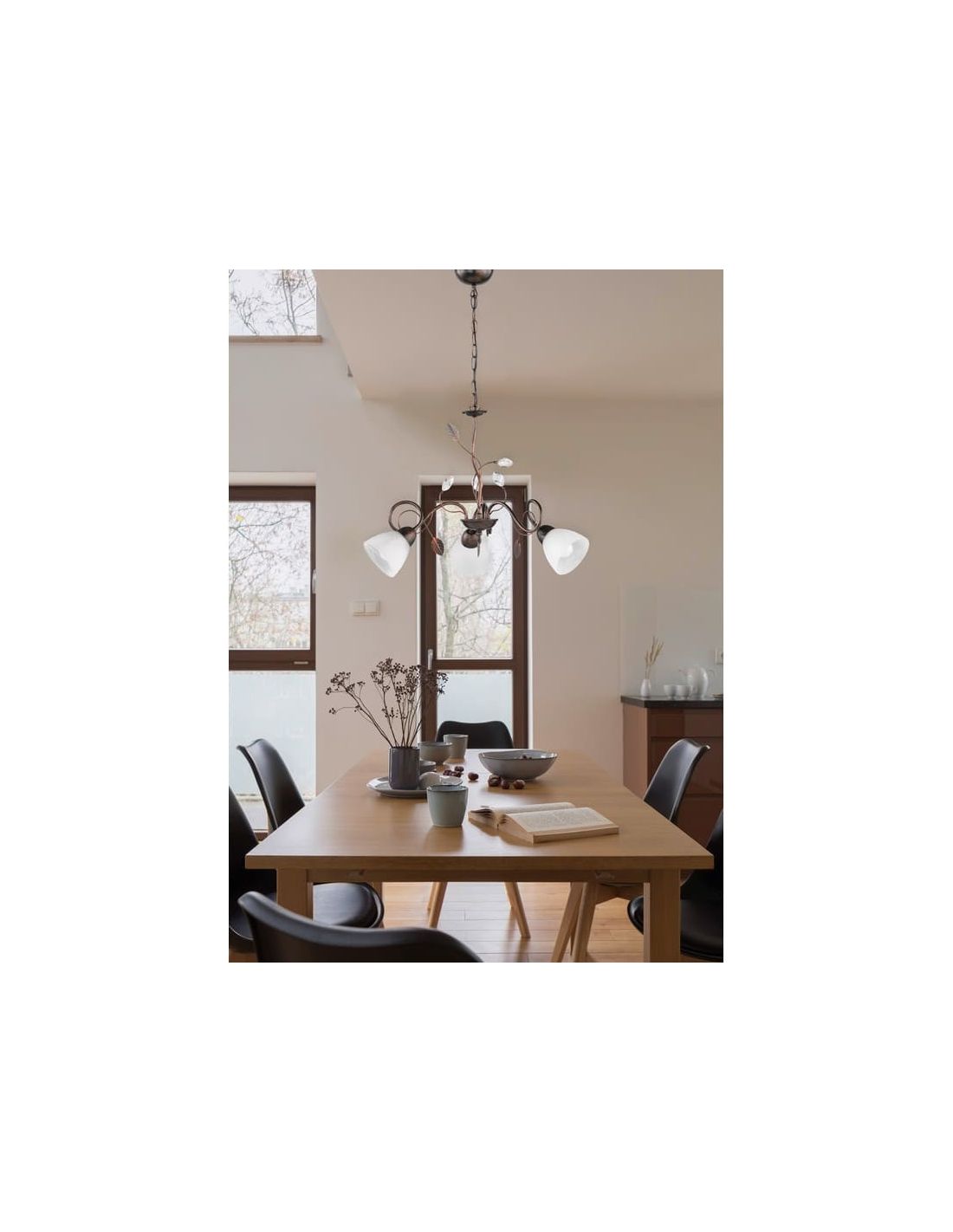 O candeeiro de teto lustre TADITIO é uma peça que acrescenta um toque de glamour e elegância a qualquer sala de estar ou sala de jantar . Desenhado num estilo clássico, este candeeiro combina formas tradicionais e cores intemporais, criando um ambiente sofisticado e acolhedor. O acabamento cor de ferrugem confere-lhe um aspecto antigo encantador, enquanto as persianas de vidro branco alabastro e as folhas de vidro espalhadas acrescentam um toque de classe e delicadeza.