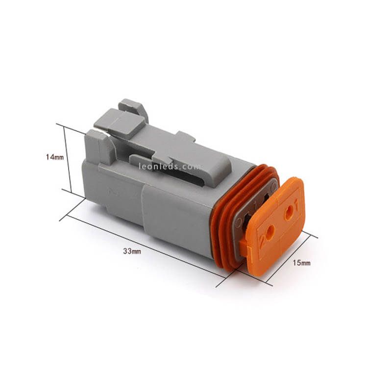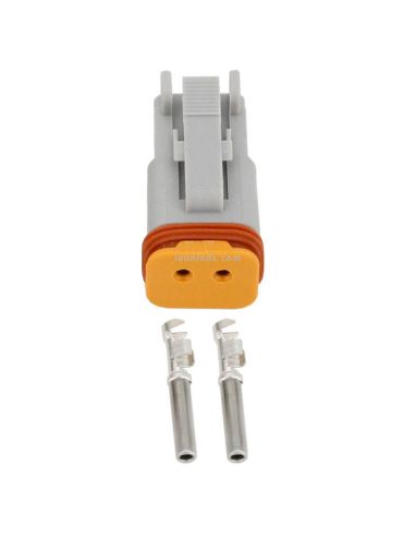 Conector modelo Deutsch de 2 pinos com 2 terminais e centragem de pinos, fabricado em policarbonato de alta resistência e com borrachas de vedação para uma conexão totalmente estanque.