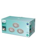 Conjunto de 3 spots de embutir Philips DIVE para banheiro, com acabamento em níquel , 3 LEDs de 5W (350 lm por spot), dimerizáveis e luz branca quente de 2700K . Classificação IP65 de resistência à água, ideal para áreas úmidas (chuveiro e pia). Tecnologia EyeComfort para iluminação confortável. Dimensões: Altura 5,5 cm | Diâmetro 8,5 cm. Diâmetro do recorte: 70 mm . Instalação direta em 220-240 V com driver integrado. Ideal para reformas de banheiro com design minimalista e desempenho eficiente.