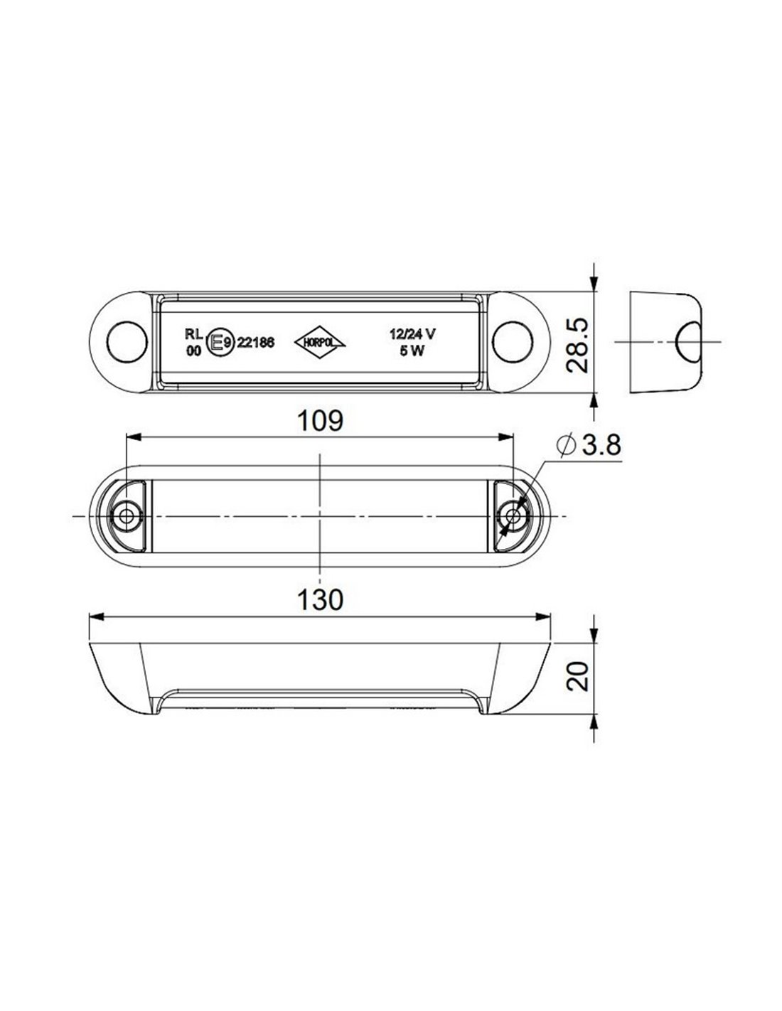 Dimensões : 130×28,5 mm | Profundidade: 20 mm | Fixação: 2ר3,8 mm