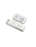 Controlador para fita LED RGBW da marca Ltech, modelo M7+M4-3A Controlador RGBW, válido para 12v e 24V DC, 4 canais para 5 A e máximo de 20A. A potência total é de 0 a 120W para 4 canais, permitindo instalar em 24V até 480W de potência, 5 tiras de LED RGBW de 72W cada tira de LED, alcançando até 30 metros de distância do receptor ao controle remoto.