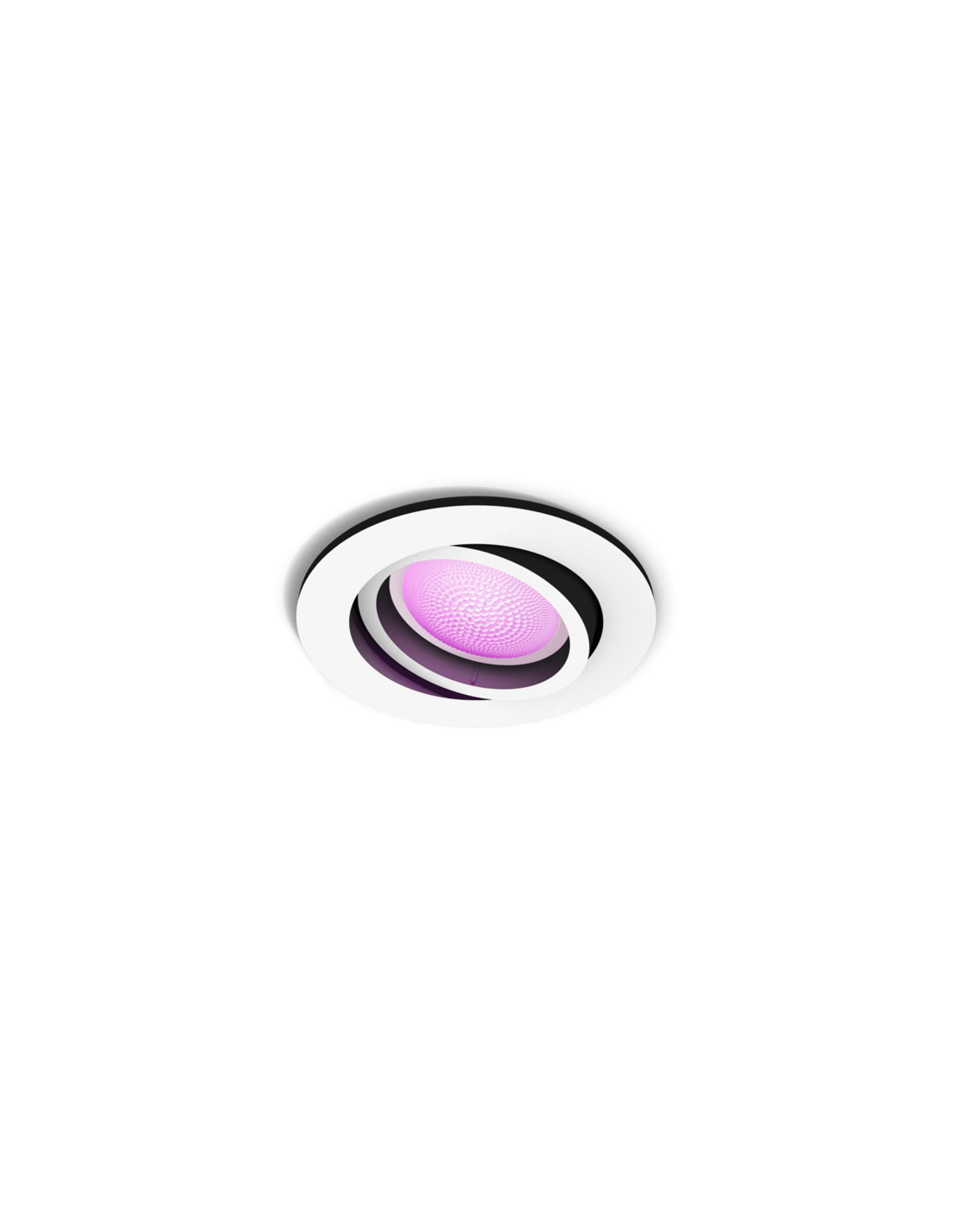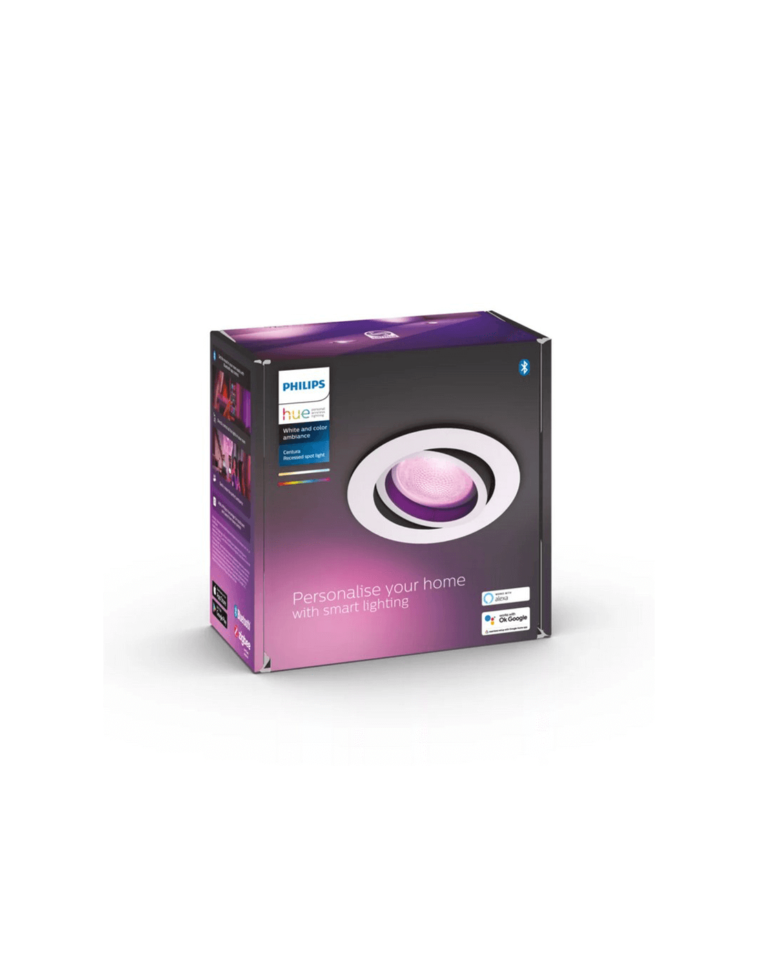O downlight embutido Philips Hue CENTURA Smart LED em branco combina um design moderno e discreto com tecnologia de iluminação avançada. Permite ajustar a temperatura da cor desde uma luz quente de 2.000K até uma luz fria de 6.500K, além de oferecer acesso a mais de 16 milhões de cores graças à tecnologia Hue White e Color Ambiance. A sua cabeça ajustável facilita o direcionamento da luz para áreas específicas, adaptando-se às diversas necessidades e ambientes.