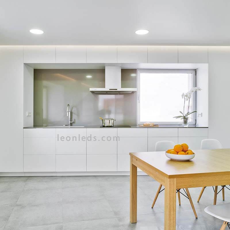 Instala-se encastrado tanto em interiores como em zonas húmidas num furo de corte de 20,5cm e devemos ter uma altura mínima de 6,5cm de altura, o Donwlight LED Fox 1 tem uma altura de 4,5cm e um diâmetro de 22,2cm.