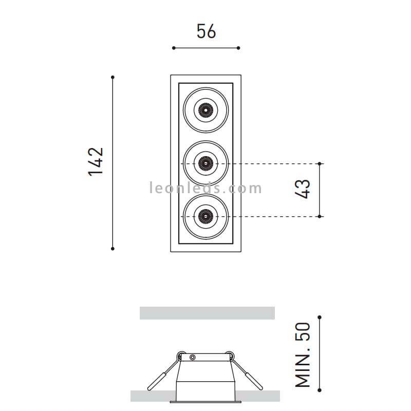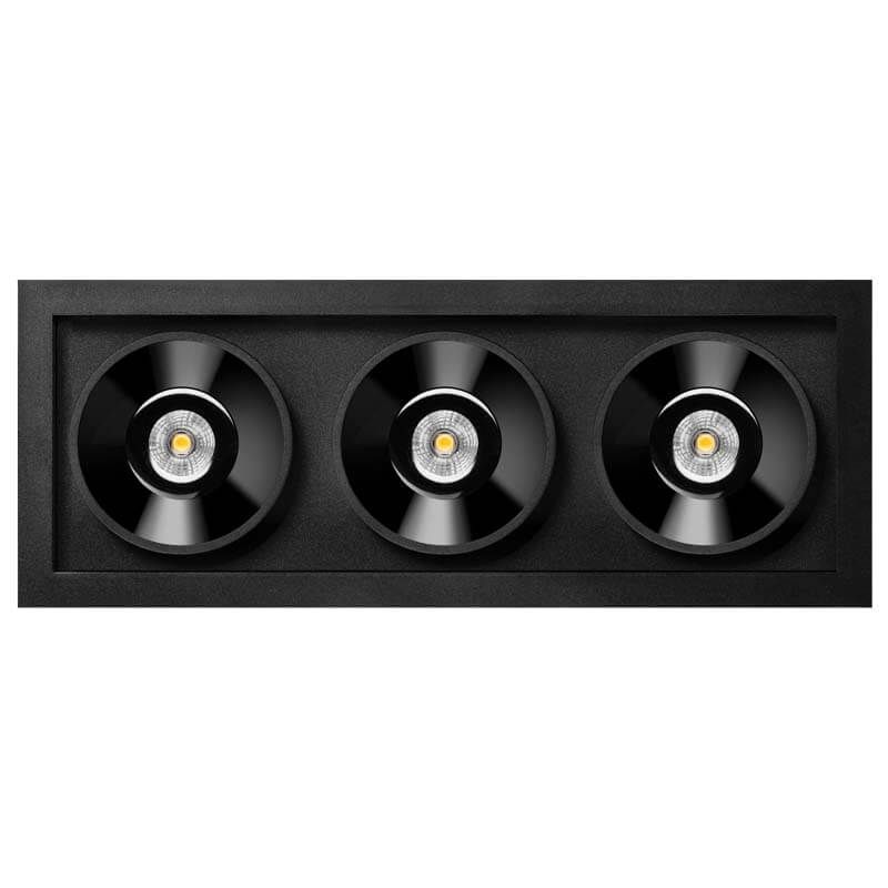 Downlight LED preto fosco de encastrar Preto Foster Encastrado 3 com formato retangular, entre os 3 focos LED oferece uma potência de 6,3w, uma intensidade de luz de 750Lm e está disponível em 3 tons de luz, 2700K, 3000K, 4000K e em 3 cores diferentes : Preto, branco e preto e preto e dourado.