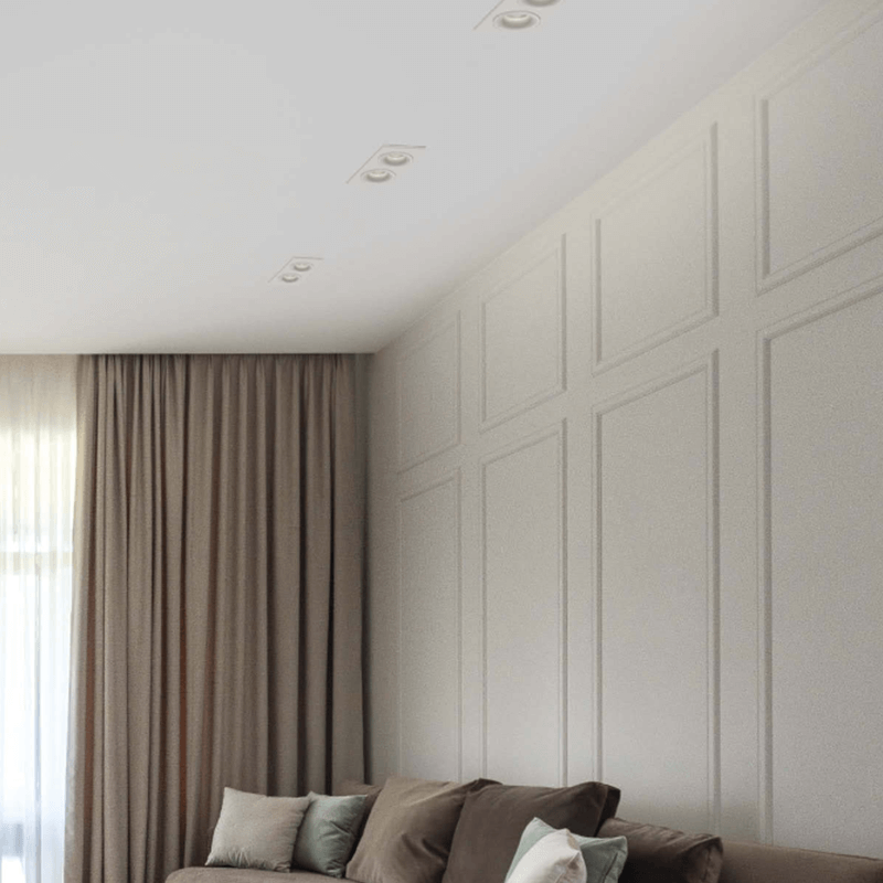 A sua estrutura metálica de cor branca estende-se por 19,5 centímetros de comprimento e 10 centímetros de largura. Além disso, a estrutura constitui 12 centímetros que estão completamente submersos e embutidos na parede para que a downlight esteja perfeitamente integrada no tecto.
