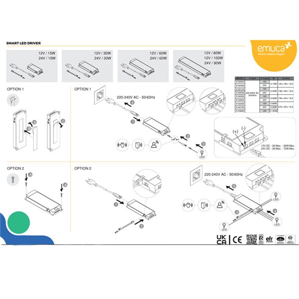 O driver LED Emuca SMART 12V DC oferece 6W de potência , projetado para alimentar luminárias LED. Sua entrada de 220-240 V e saída de 12 V CC o tornam uma opção eficiente e segura. Inclui proteção contra sobrecarga e design compacto.