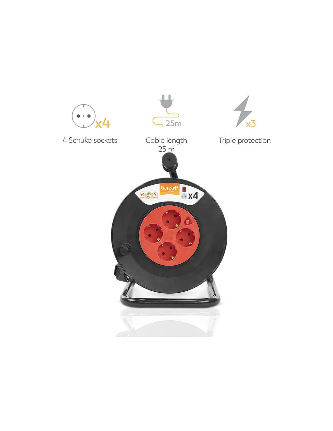 Enrolador de cabo Garza com 25 metros de cabo e 4 tomadas Schuko com proteção para crianças . Inclui alça de transporte e proteção contra sobrecarga térmica . Perfeito para uso doméstico ou profissional, com capacidade de até 3000 W (10 A / 250 V) . Robusto, prático e seguro para trabalhos em ambientes internos ou externos protegidos.