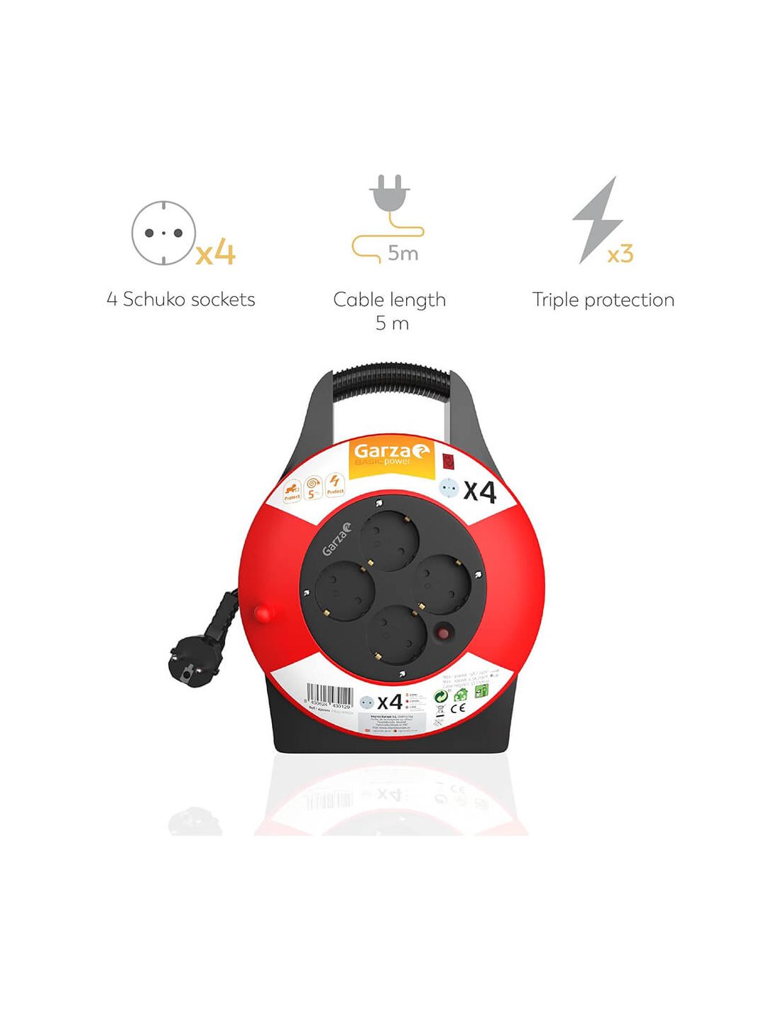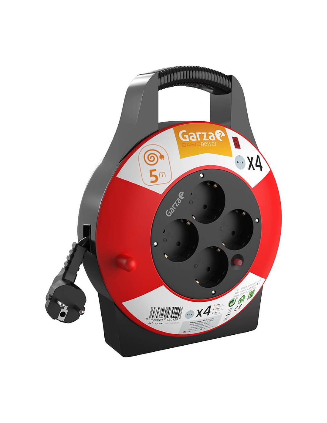 Enrolador de cabo doméstico Garza Power com 4 tomadas Schuko , alça de transporte e cabo de 5 metros. Com proteção contra crianças e sobrecarga. Compacto, durável e seguro para o uso diário em casa ou no escritório.