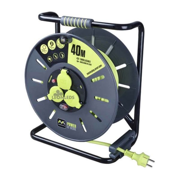 Enrolador de cabo verde e cinza IP44 com 40 metros de cabo FG3C2 3x2,5m2 , inclui 3 tomadas Schuko com tampa e proteção, chave liga/desliga e indicador de operação, também inclui dispositivo de segurança Thermal Cut para superaquecimento e alça extensível para recolher o cabo com maior segurança.