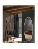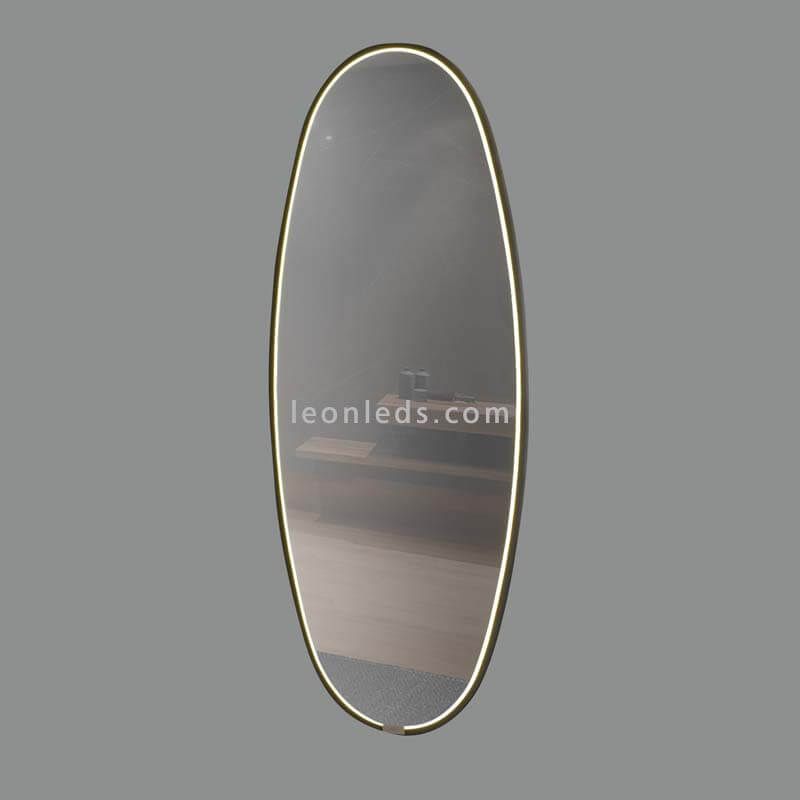 O espelho Onix LED tem 185 cm de altura, 70 cm de largura e 3,5 cm de espessura. Como você pode ver, é um espelho grande com moldura preta e formato oval.