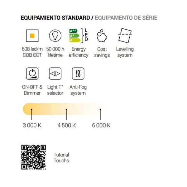 Com este toque selecionamos a temperatura de luz desejada 3.000K, 4500 K ou 6000 K (quente, neutra ou fria). A opção permanece armazenada na memória para a próxima inicialização.