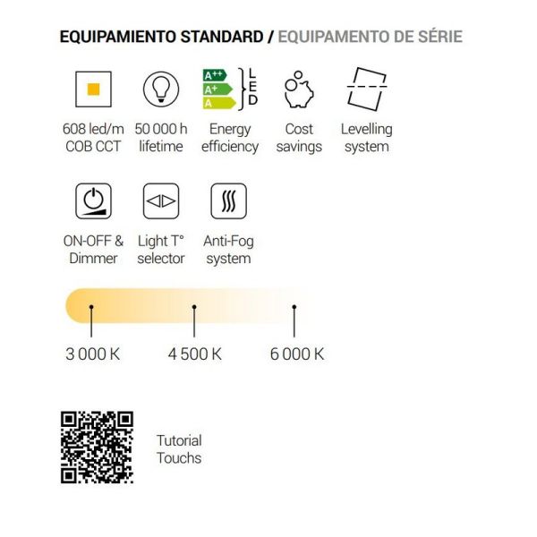 Com este toque selecionamos a temperatura de luz desejada 3.000K, 4500 K ou 6000 K (quente, neutra ou fria). Resta a opção armazenada na memória para a próxima ligação.