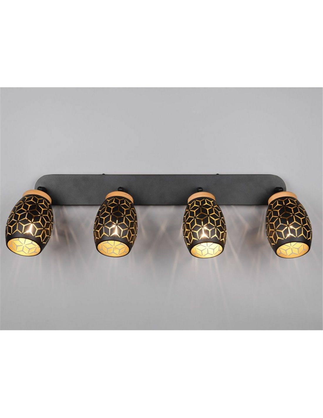 Fita de teto BIDAR com 4 focos orientáveis em acabamento preto metalizado, ideal para uma iluminação versátil e moderna. Compatível com lâmpadas E14 (não incluídas) até 10W. Design elegante com certificação IP20 .