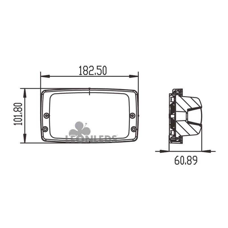 Farol LED retangular encastrado com potência de 36W, intensidade de luz efetiva de 3908Lm e teórica de 9.900Lm, óptica de trabalho, inclui meio metro de cabo para instalação e é totalmente à prova d'água IP69K. A referência do farol da lâmpada Hella a substituir é esta 1GB006213101.