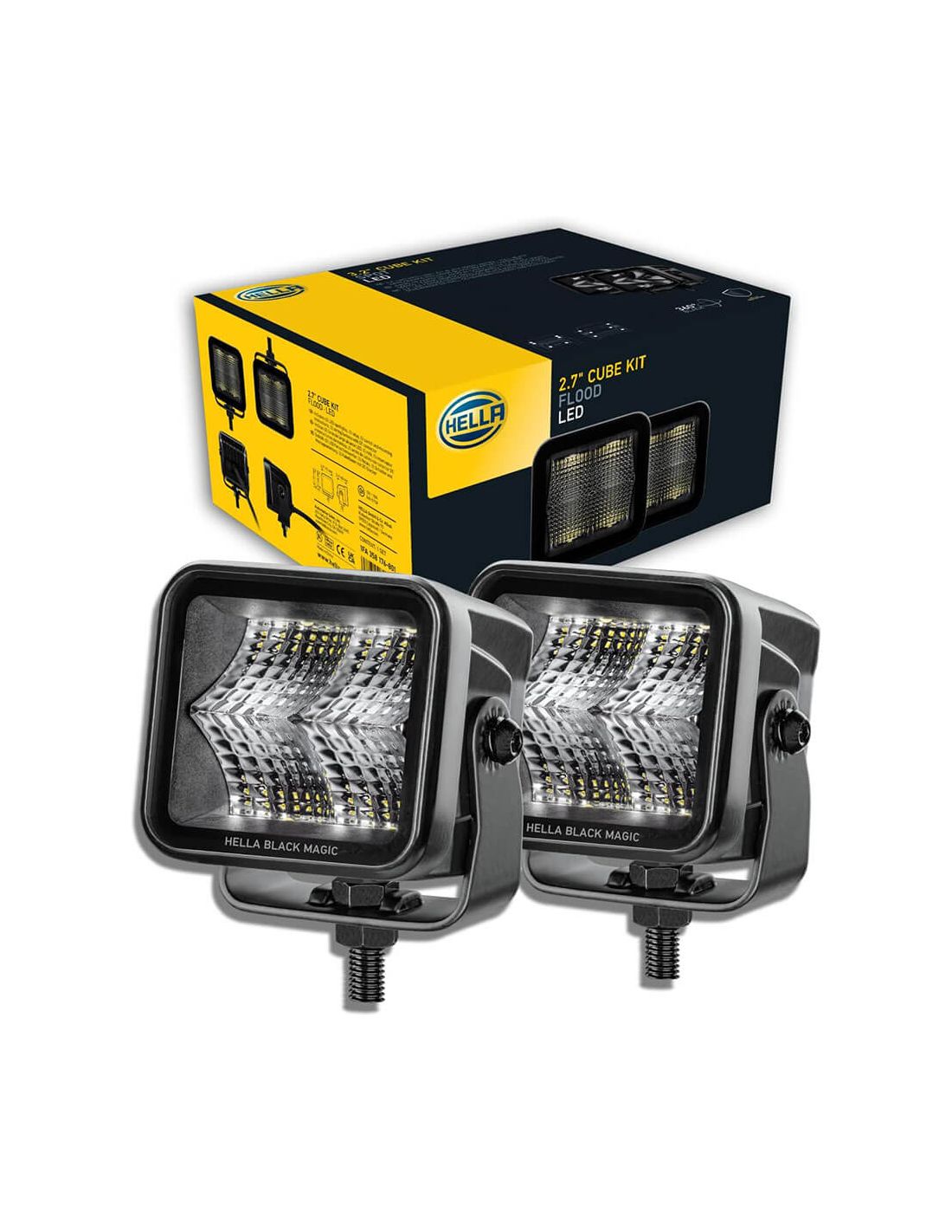 Kit de farol HELLA Black Magic Cube de 2,7 polegadas , 12/24 V, 1400 lúmens, conector DEUTSCH e suportes pretos incluídos. Proteção IP68/IP69K e certificação ECE R10 . Iluminação LED de campo próximo, ideal para todos os tipos de veículos off-road.