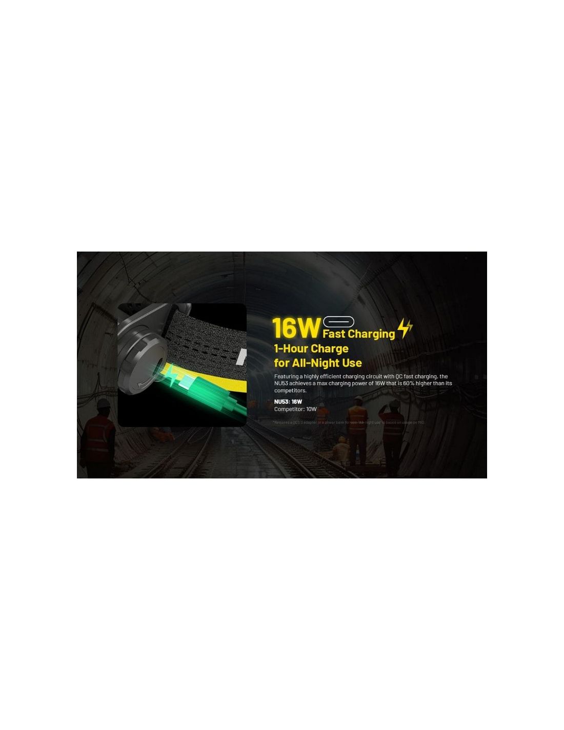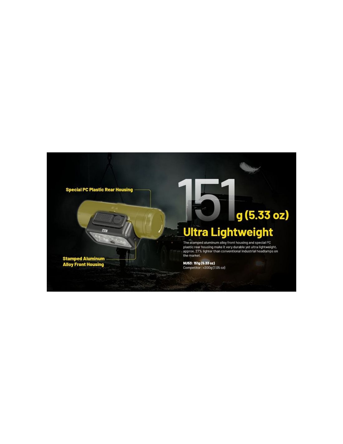 Farol LED NU53 NITECORE ultraleve, recarregável via USB-C e com alcance de 175 metros. Ele fornece potência de até 1.800 lúmens e possui modos de luz branca e vermelha . Ideal para atividades ao ar livre, resgate, caminhadas e trabalhos noturnos. Peso de 151 g e autonomia máxima de 153 horas .