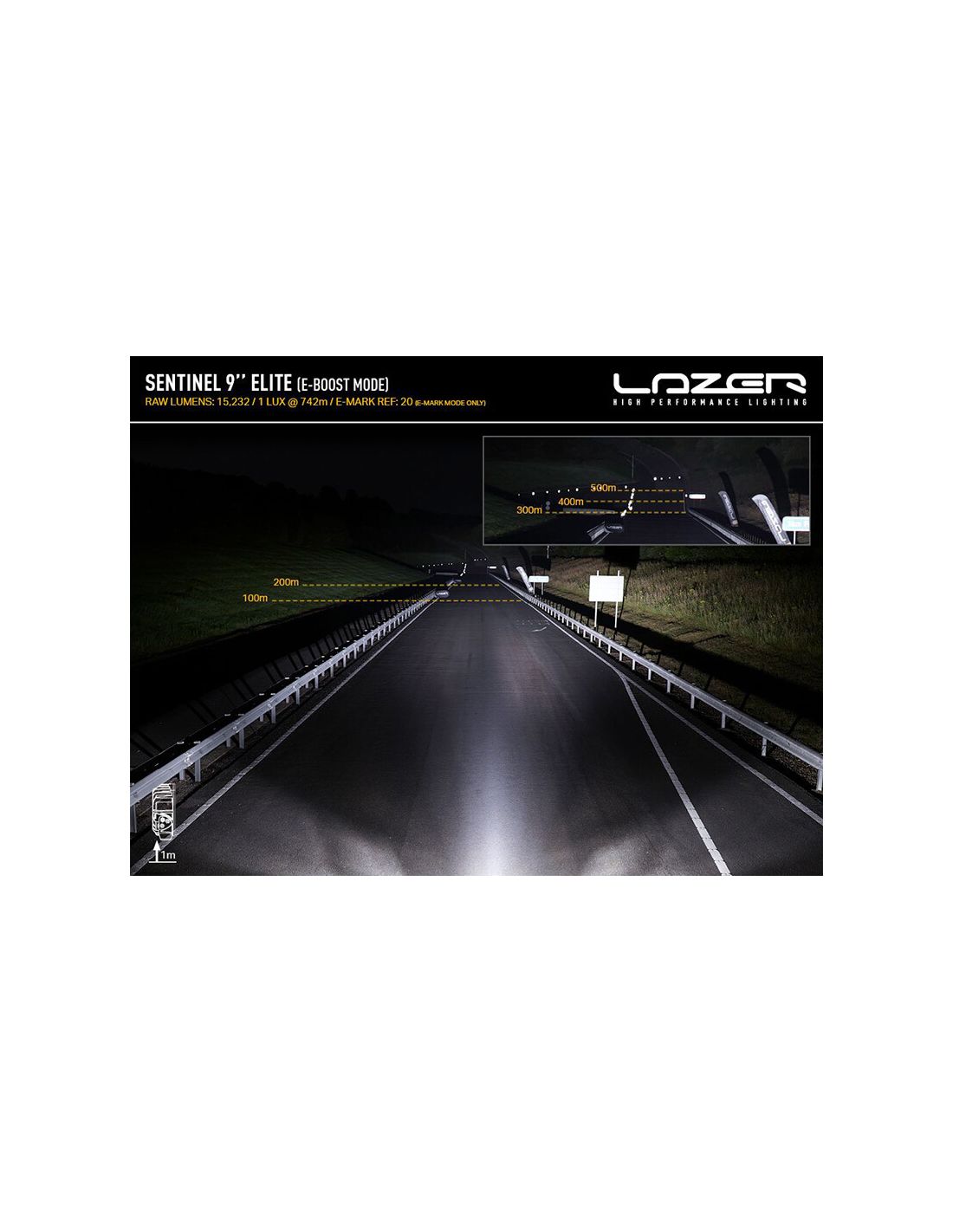 Farol LED profissional de longo alcance da Lazer Lamps, modelo SENTINEL 9" Standard, na cor branca , com modo E-Boost. Potência máxima de 87 W, 9520 lúmens e aprovação ECE R112. Ideal para uso em estrada (modo legal) e off-road (modo Boost). Luz de posição âmbar e branca. Códigos de aprovação ECE R112, ECE R7, ECE R10 e 20 pontos de luz.