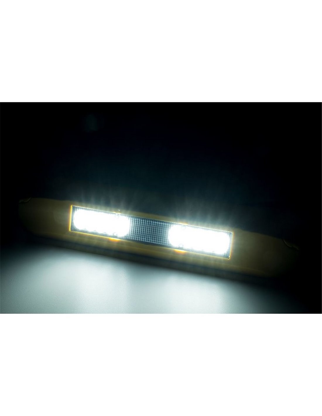 A luminária atende aos padrões IP68 , garantindo total estanqueidade e resistência a impactos e variações térmicas. Seu design retangular oferece um alcance aproximado de 8 metros e melhora a visibilidade em condições noturnas. A carcaça amarela facilita a rápida identificação do equipamento em ambientes de trabalho e utiliza peças de acabamento e uma junta de vedação inferior para um acabamento limpo e protegido.