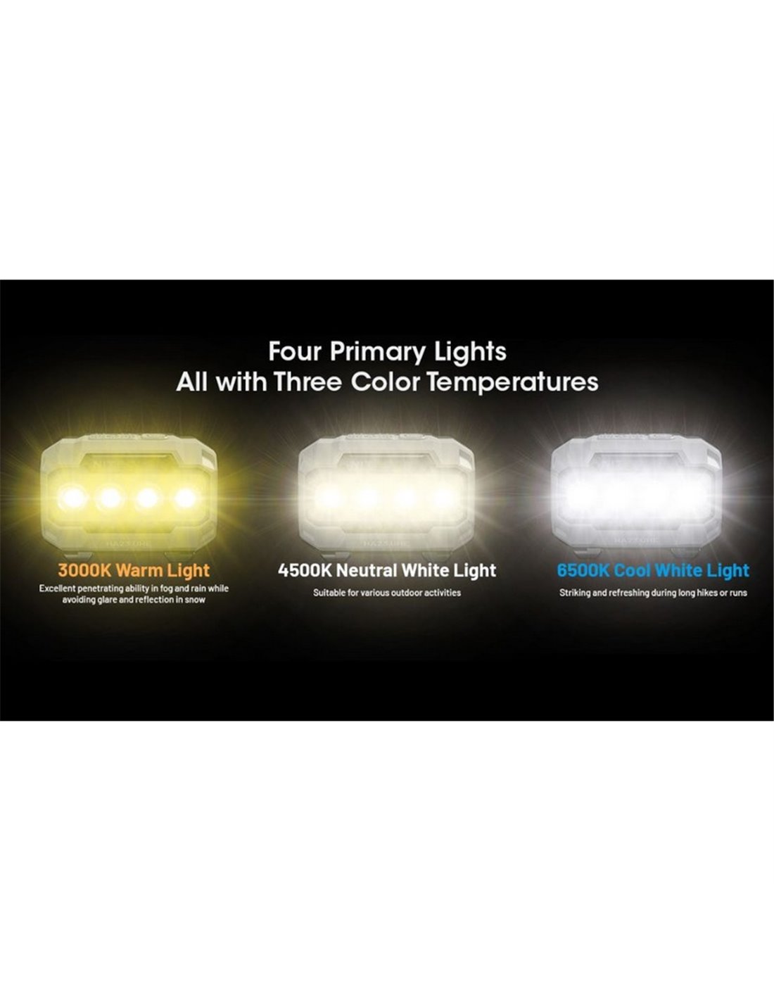 Lanterna de cabeça azul ultraleve com 600 lúmens verdadeiros , três cores de luz (3000K a 6500K) e alcance de até 132 m . Funciona com pilhas AAA ou bateria recarregável . Classificação IP66 para uso externo.