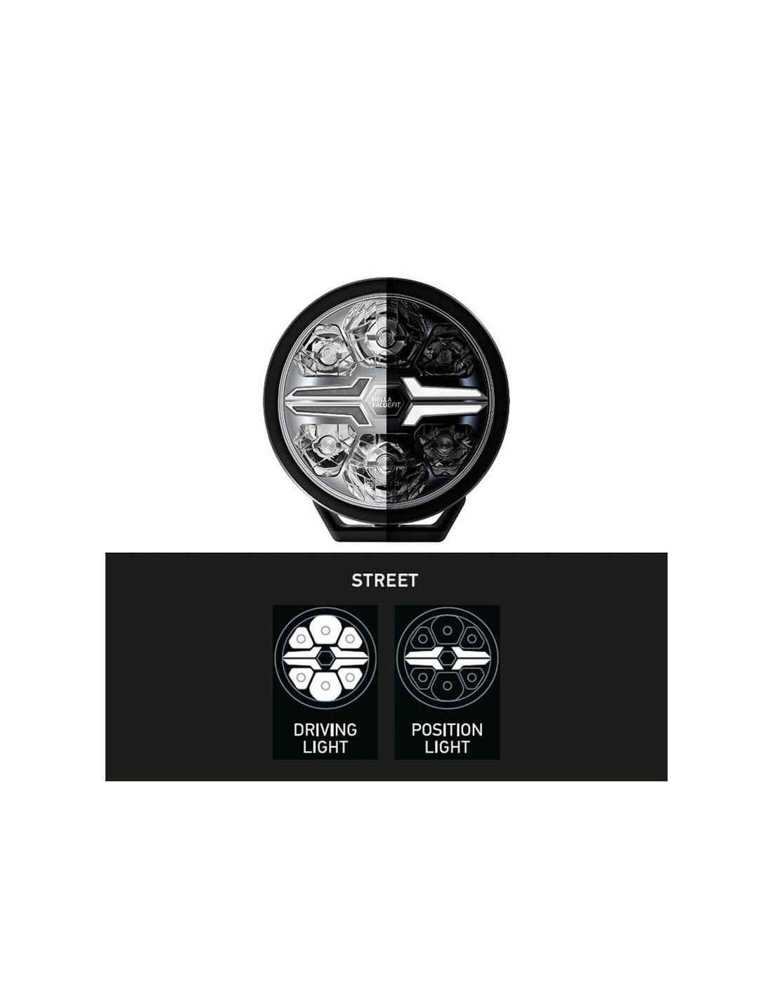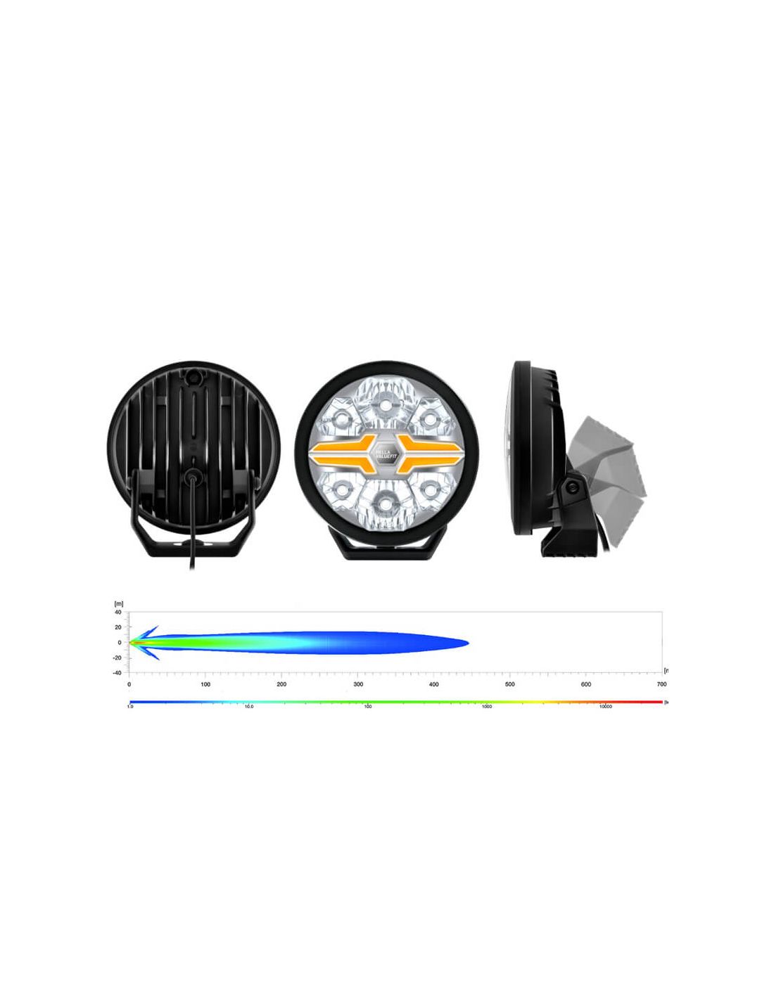 Farol LED preto com âmbar, luz de posição branca e luz de longo alcance Modelo Blade Homologado com diâmetro de Ø 18cm, para ser instalado na frente de carros, 4x4, OffRoad e caminhões com potência de 22W válido para 12V e 24V. Inclui luz de posição branca e âmbar aprovada (não ECE), pode ser conectada usando o cabo que inclui 50 centímetros.