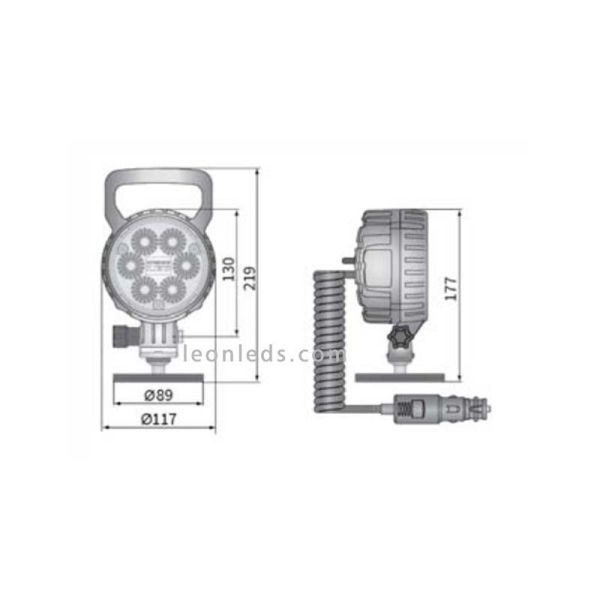 Luz de trabalho LED com interruptor e base magnética com cabo espiral de 8 metros e com conector mais leve. Você pode escolher entre os 3 potências disponíveis, 29W que frita uma intensidade de luz de 2.500Lm, 25W que oferece 2,000Lm e 24W que oferece 1.500Lm, em ambos os casos inclui 6 Chips LED marca Cree e um protetor de tulipa de policarbonato preto que podemos remover se quisermos. O ângulo de feixe de luz está disponível em 50o, amplo campo de visão e 4o, farol de longo alcance.