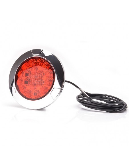 Farol de neblina LED redondo com acabamento prateado para reboques e caminhões, válido para instalações de 12V e 24V, totalmente homologado.