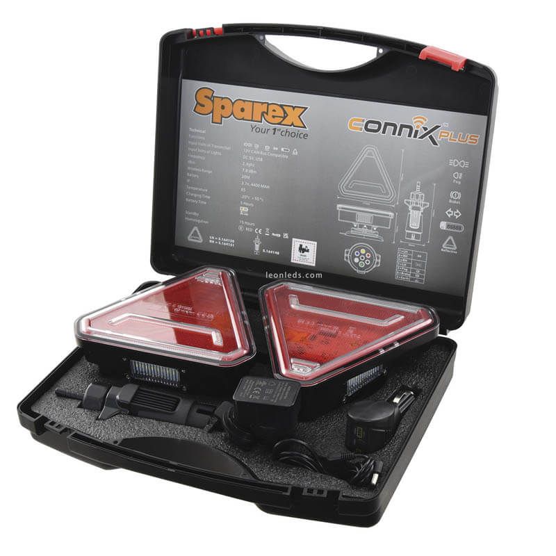 Kit de piloto sem fio Connix Plus LED que consiste em 2 pilotos traseiros com triangulo LED de 4 funções e com base magnética, um cabo micro USB para carregar os dois pilotos de cada vez, carregador 220V e carregador mais leve, 7 abacaxi de pinheiro de Macho para instalar na base feminina, este abacaxi inclui resistências (Canbus) que impedem o veículo de indicar a falha do bulbo derretido devido ao baixo consumo destes pilotos LED. O kit Reposição Connix Plus LED funciona tanto em instalações 12V e entre o receptor e os pilotos pode haver uma distância máxima para a operação da Peças de reposição LED Connix estar correto até 20 metros.