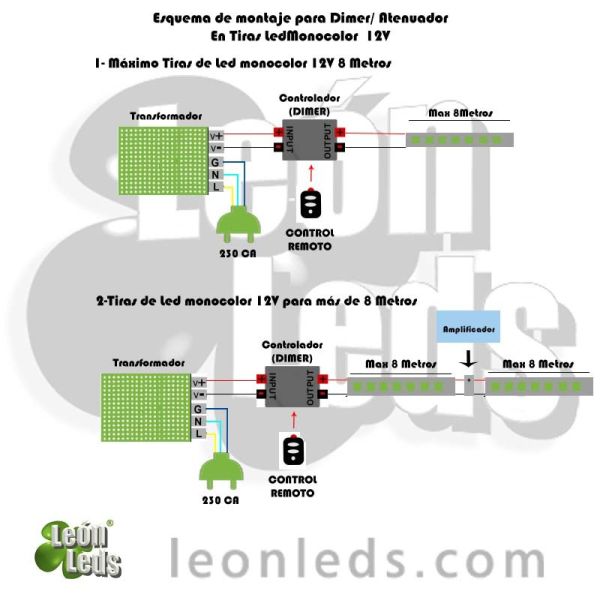 Você pode instalar esta faixa direta ou com Dimmer (Regulamento de intensidade)Na instalação com Dimmer podemos instalar o Dimmer que queremos, com controle remoto, Dimmer na caixa de mecanismo ou Dimmer sem comando. Deixamos um esquema para instalação com Dimmer. Em caso de instalação sem Dimmer só teremos que conectar os cabos diretos da fonte à tira.