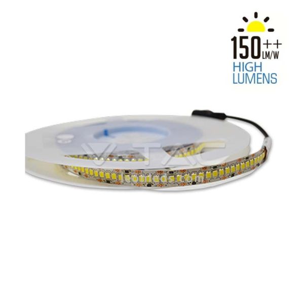 12 volts LED de alta luminosidade + 150Lm/W, 240 chip conduzido por metro com uma potência por metro de 18W, um consumo de 1,5 amper por metro, uma intensidade luminosa de 3000 lumens com um grau de proteção contra a poeira e umidade de IP20 (uso interior exclusivo) e um tom frio de luz 6400K.