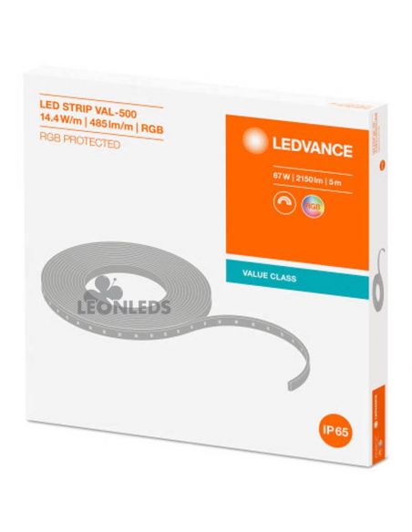 Faixa de LED rgb IP65 ou ip20 para 24v da marca LedVance com uma potência total de 5 metros de 61W, uma potência por metro de 14,4W e uma intensidade de luz total de 2.400Lm e 1.370Lm cada tira de medidor. Esta tira led consiste em um chip rgb que é composto de azul, verde e vermelho, então você vai encontrar os dados de luz: