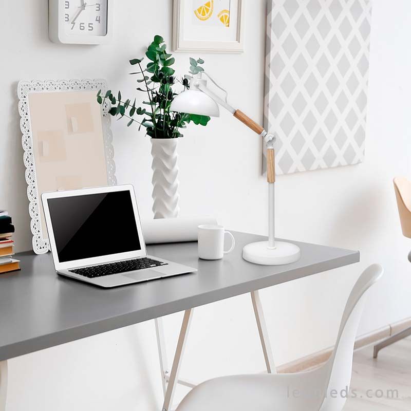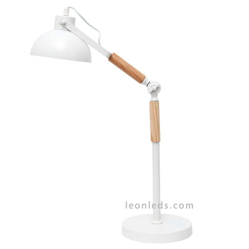 Nordic Style Studio Flex da série Upsala Fabrilamp. É isto. Lâmpada de sobreposição é feito de metal branco com partes da estrutura de madeira, uma exposição branca com dois parafusos decorativos. O corpo permite levantar a tela, uma vez colocado na altura que queremos, nós devemos apertar umas nozes para corrigir o braço.