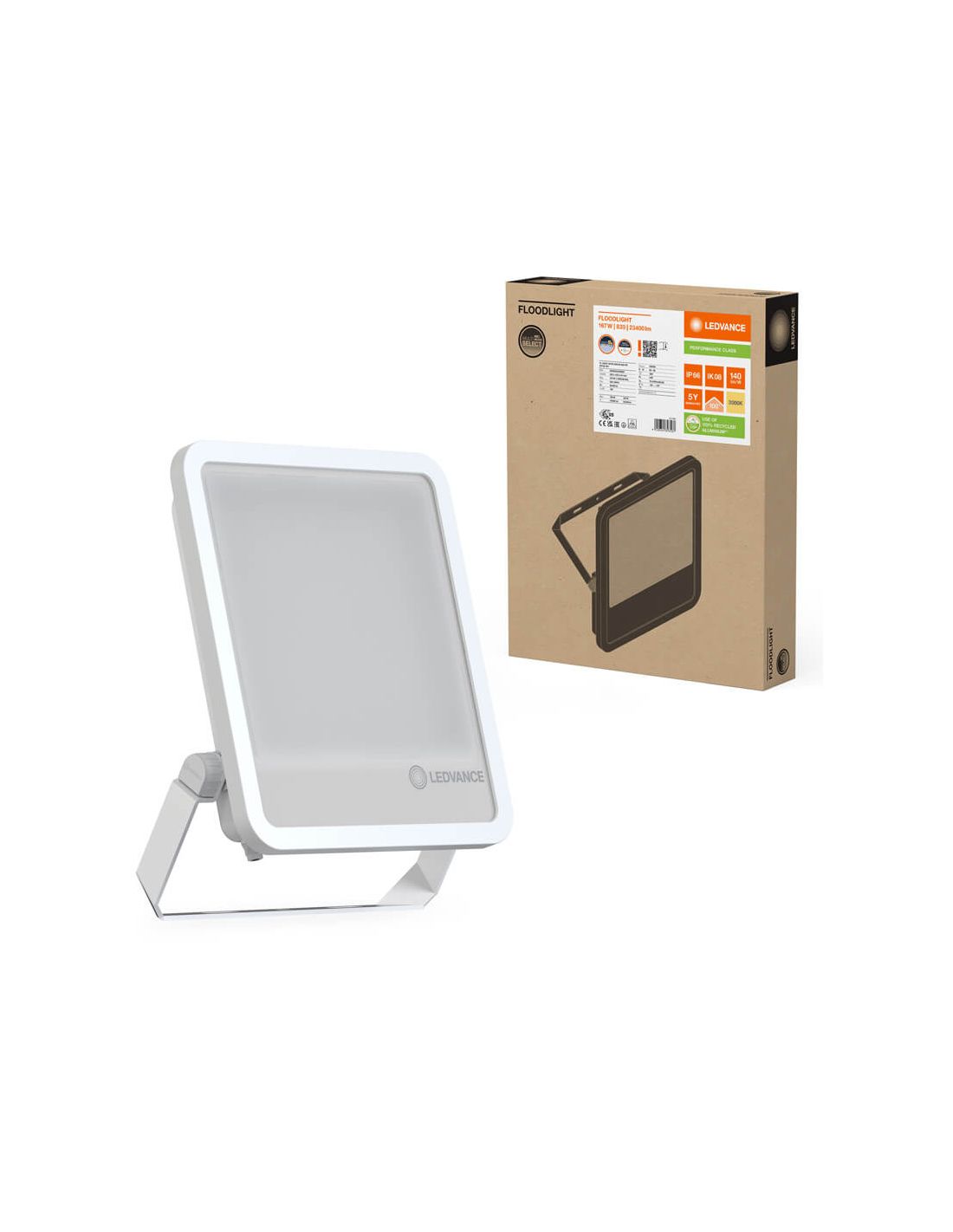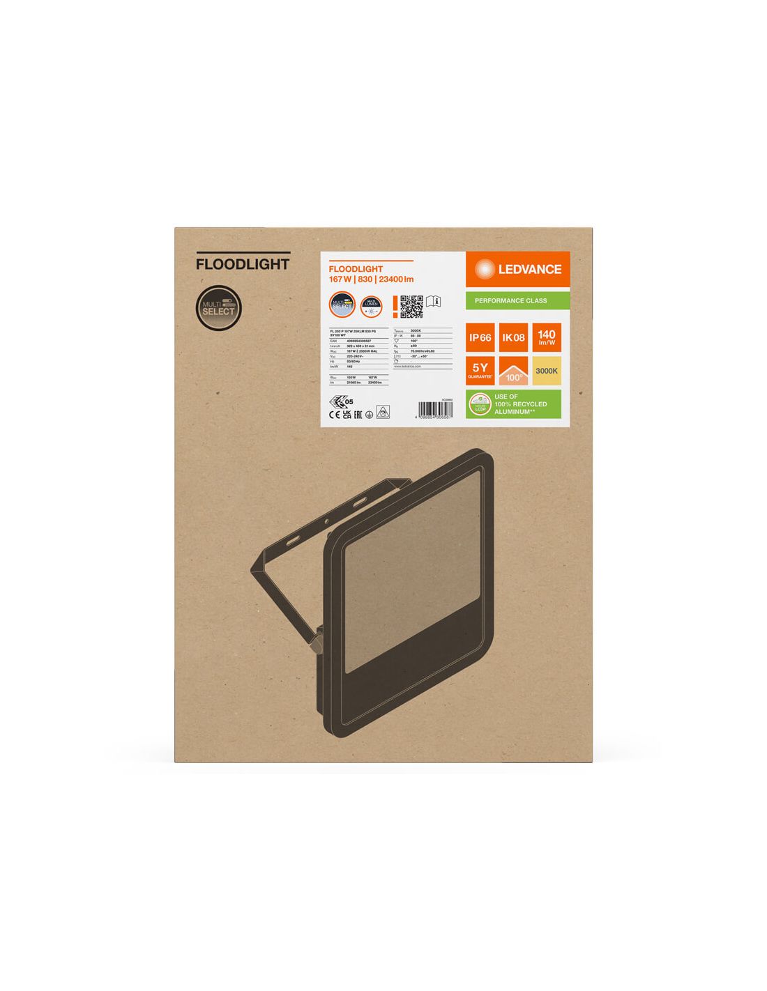 Projetor LED branco 167W/150W com 25.000Lm . Alta eficiência com seletor de potência, proteção IP66 e vida útil de até 100.000 horas . Disponível em 3000K, 4000K e 6500K. Possui seletor de potência de 23.400 Lm e 21.060 Lm em 3.000 K e 25.000 Lm e 22.250 Lm e 4.000 K e em 6.500 K, garantia de 5 anos da linha LedVance Performance, óptica simétrica. Proteção contra sobretensão de 6 Kv.