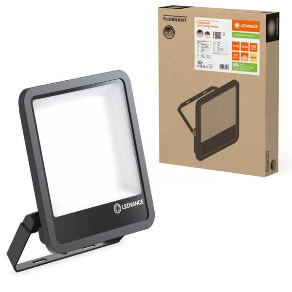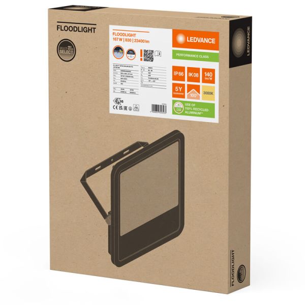 Holofote LED preto 167 W , 25.000 Lm, IP66. Seletor de potência para máxima versatilidade, vida útil de 100.000 horas e disponível em 3000K, 4000K e 6500K. Possui seletor de potência de 23.400 Lm e 21.060 Lm em 3.000 K e 25.000 Lm e 22.250 Lm e 4.000 K e em 6.500 K, garantia de 5 anos da linha LedVance Performance, óptica simétrica. Proteção contra sobretensão de 6 Kv.