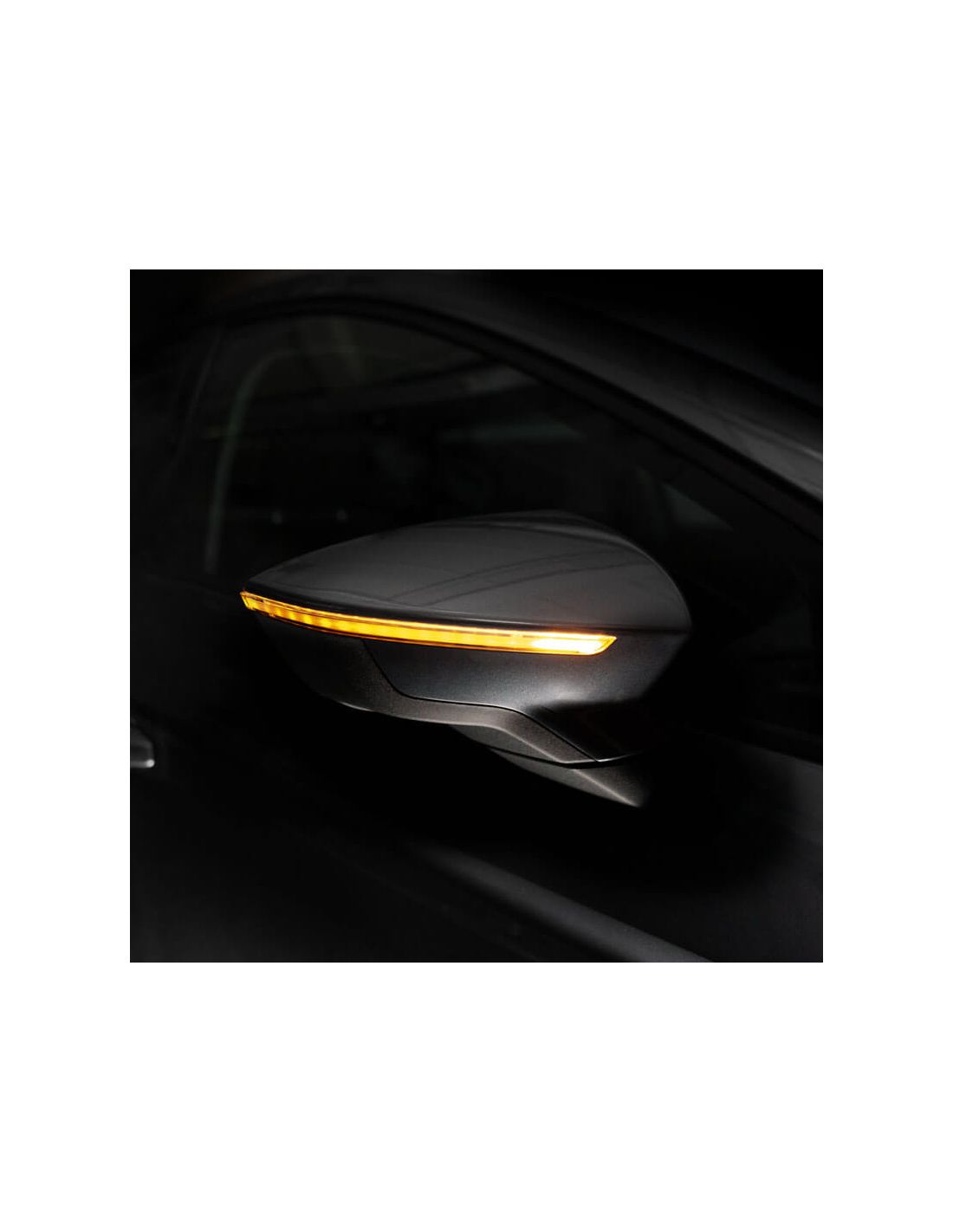 Conjunto de 2 piscas dinâmicos homologados Black Edition para serem instalados no retrovisor dos automóveis Seat León (desde 2012), Ibiza (desde 2018), Arona (desde 2018), adaptam-se perfeitamente aos retrovisores originais e não é necessário faça quaisquer modificações adicionais, produtos homologados com ECE R6 e R10 que lhe permitam passar no ITV sem problemas. Com 5 anos de garantia. Inclui manual de instalação.