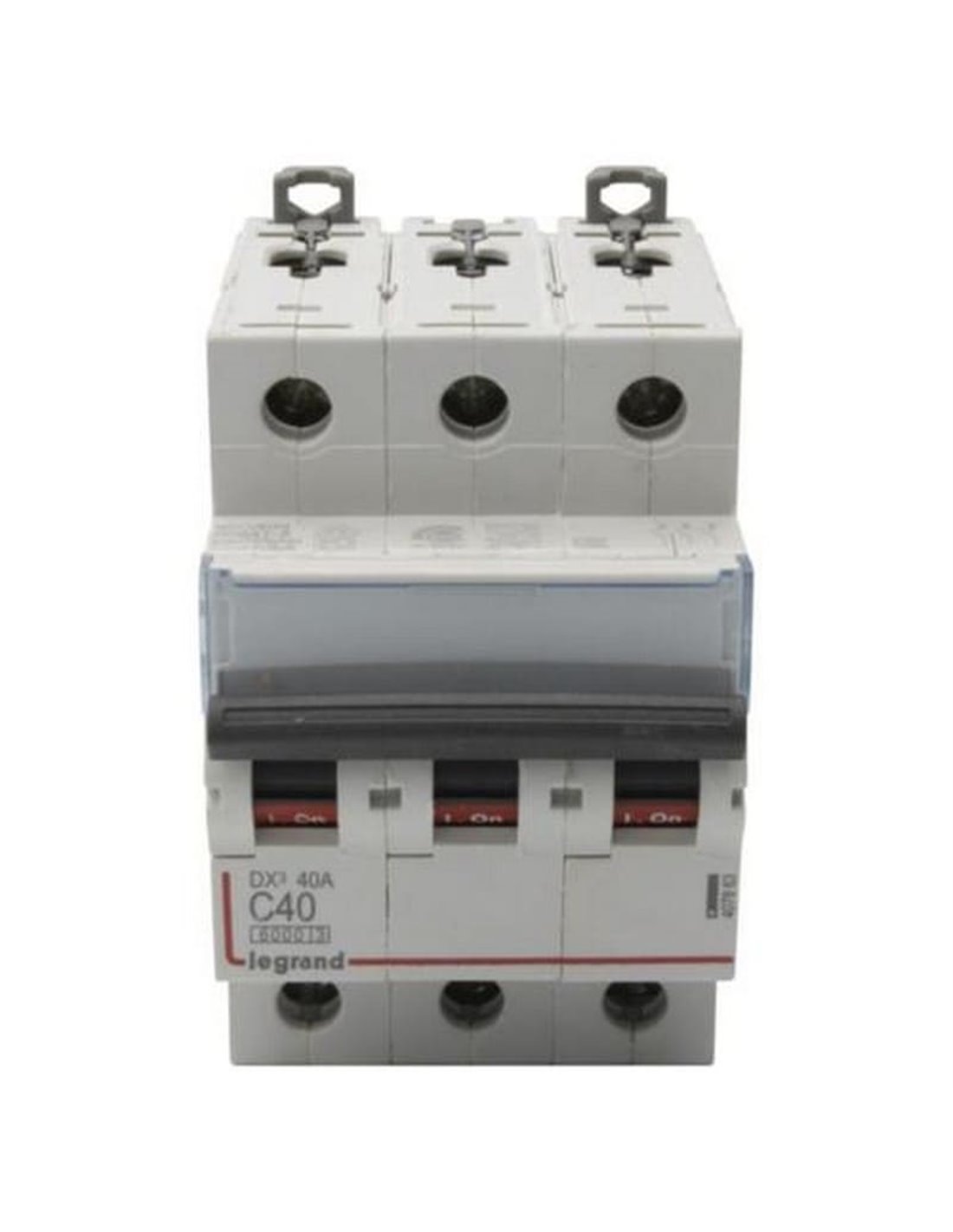 Interruptor magnetotérmico automático Legrand DX³ 3P 40 A com curva C e capacidade de interrupção de 6 kA conforme IEC/EN 60898-1 . Terminais IP20 (à prova de toque), limitação de energia classe 3 e indicador ON/OFF . Aceita cabo , pente garfo/dente e plugue HX³ . Formato de 3 módulos para trilho DIN, 400 V CA. Compatível com auxiliares DX³ e dispositivos de corrente residual .