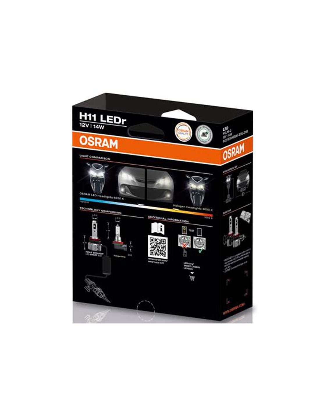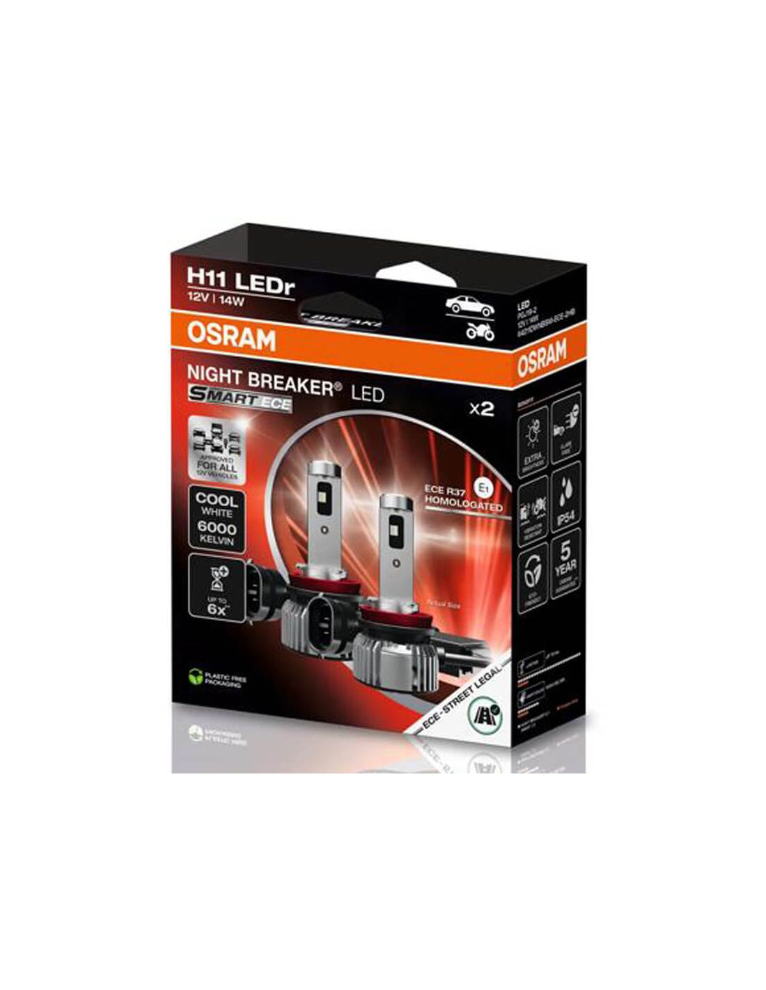 O kit de lâmpadas LED OSRAM NIGHT BREAKER SMART H11 (2 lâmpadas) proporciona uma iluminação brilhante em branco frio (6000K) , ideal para melhorar a visibilidade na estrada. Com um fluxo luminoso de 1350 lúmens e uma potência de 14W, oferecem até seis vezes mais vida útil do que uma lâmpada halógena convencional , atingindo 3000 horas.