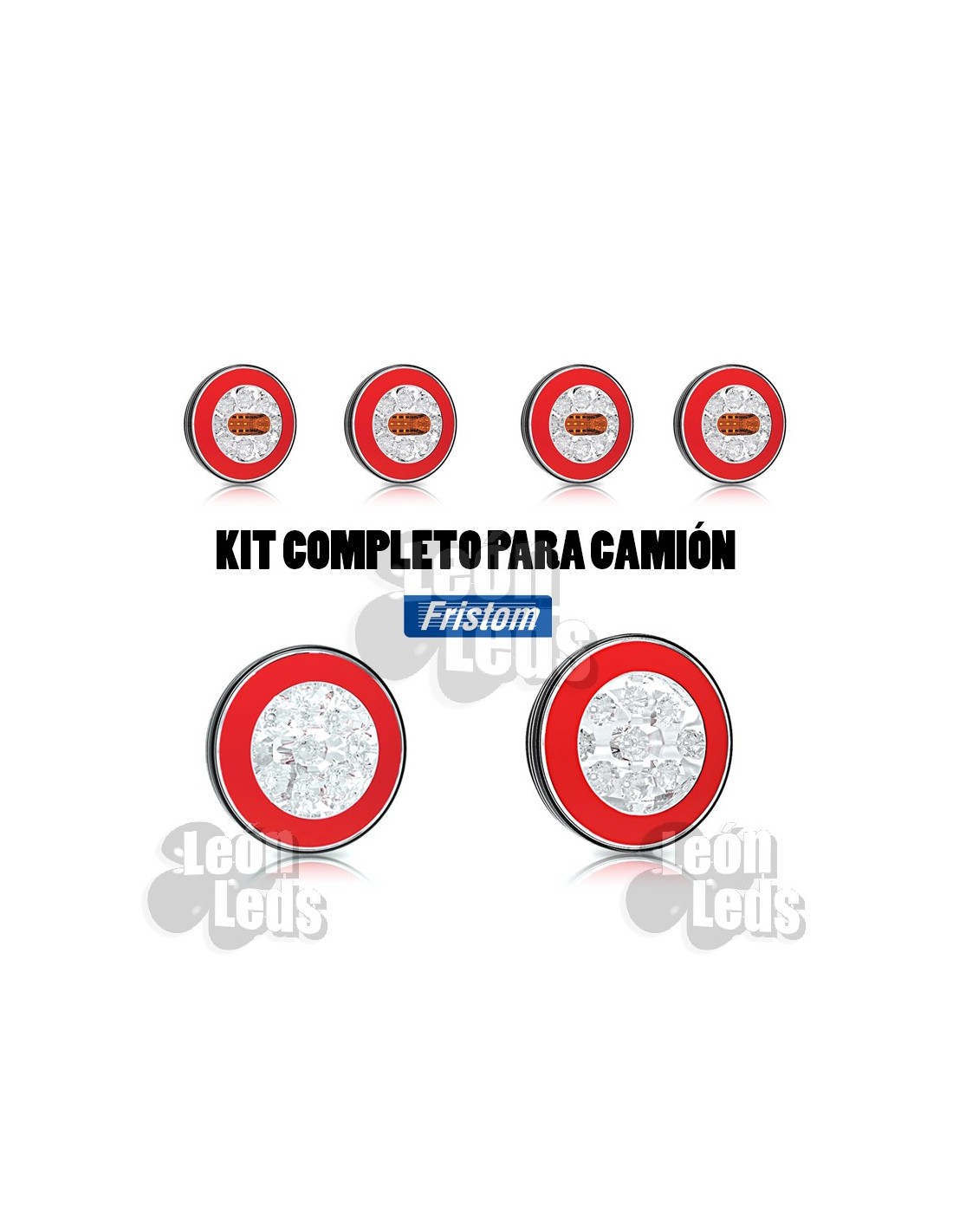 Kit Lâmpada Traseira LED ronda para caminhões de marca Fristom composto por referências FT-110 (4 pilotos de posição com 3 funções), FT-111 (1 reverso piloto com 2 funções) e FT-112 (1 piloto de nevoeiro com 2 funções).