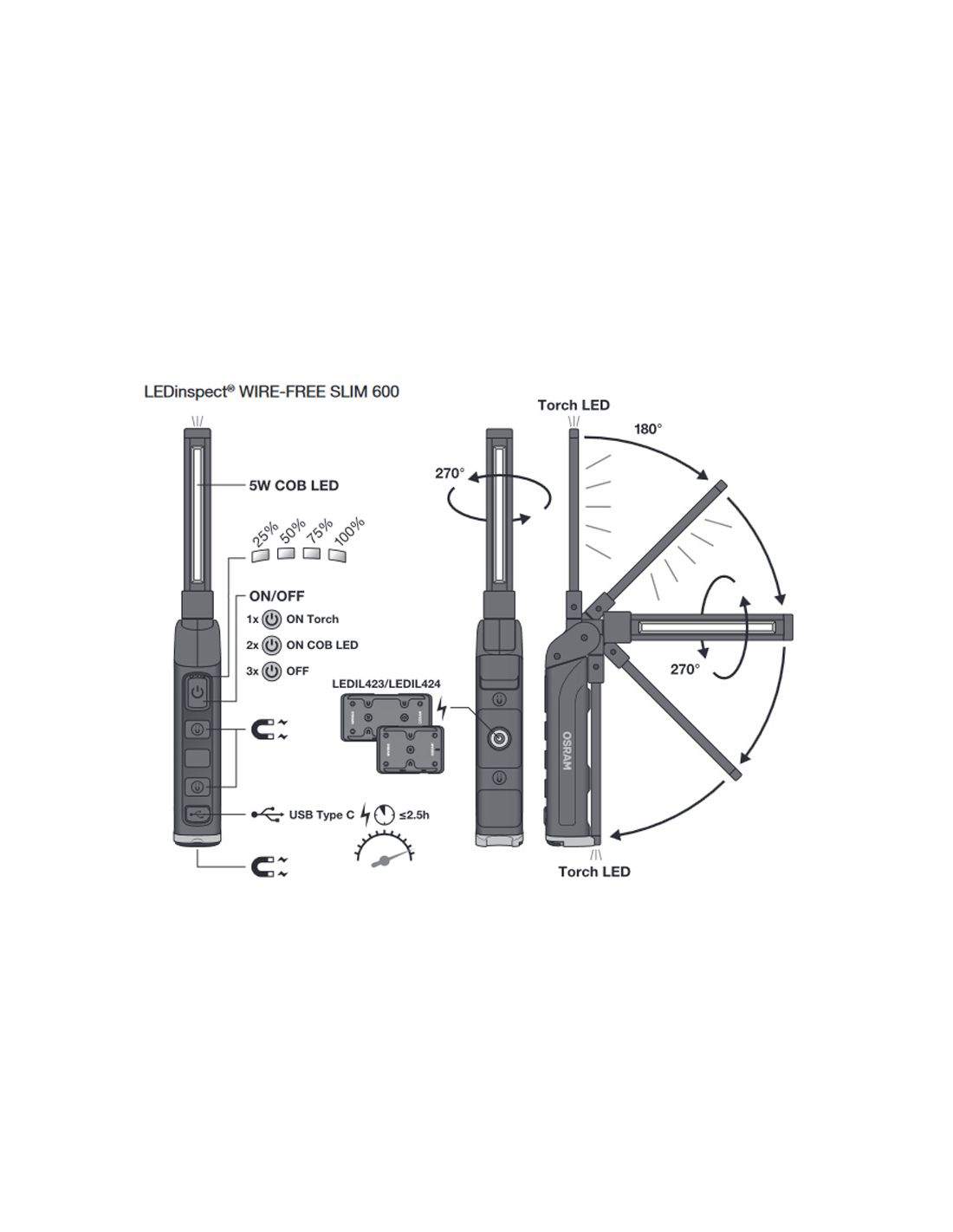 A Lâmpada de Inspeção LED OSRAM WIRE-FREE SLIM 600 redefine a conveniência com seu sistema de carregamento magnético sem fio, eliminando a necessidade de plugues. Com 600 lm de luz branca e temperatura de cor de 5700K, é ideal para inspeções detalhadas em oficinas e garagens. O seu design compacto (37 mm de altura, 325 mm de comprimento, 43 mm de largura) e o peso de 240 g facilitam o seu manuseamento. Com tecnologia LED e certificações CE, EMC, MSDS e ROHS, esta lâmpada é obrigatória para profissionais. Disponível em LeonLeds.com.