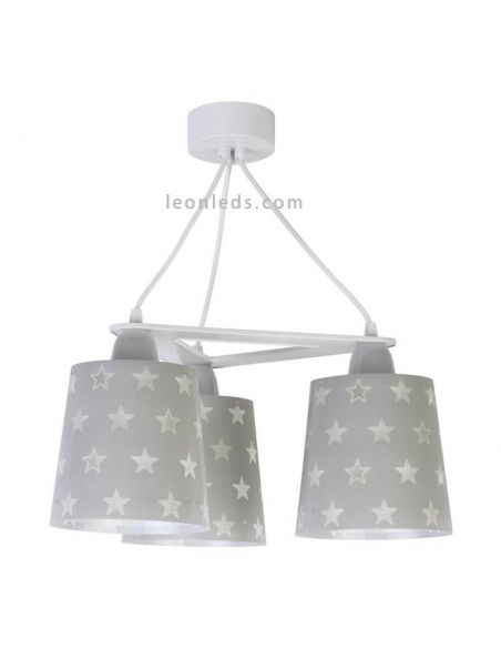 Lâmpada de teto infantil com 3 telas redondas decorado com estrelas transparentes com um fundo cinza, o contorno das estrelas brilha na escuridão. As 3 telas redondas têm uma altura de 20.5Cm e um diâmetro de 15cm. A altura desta lâmpada é ajustável e o resto das dimensões que você pode ver em uma das fotos.