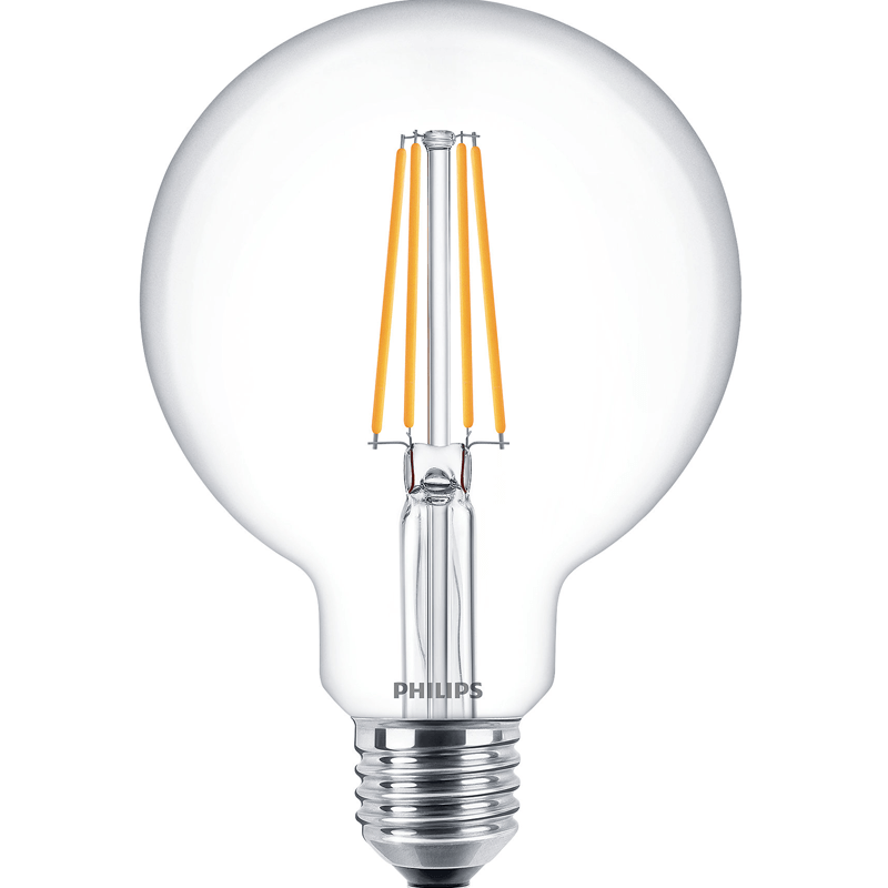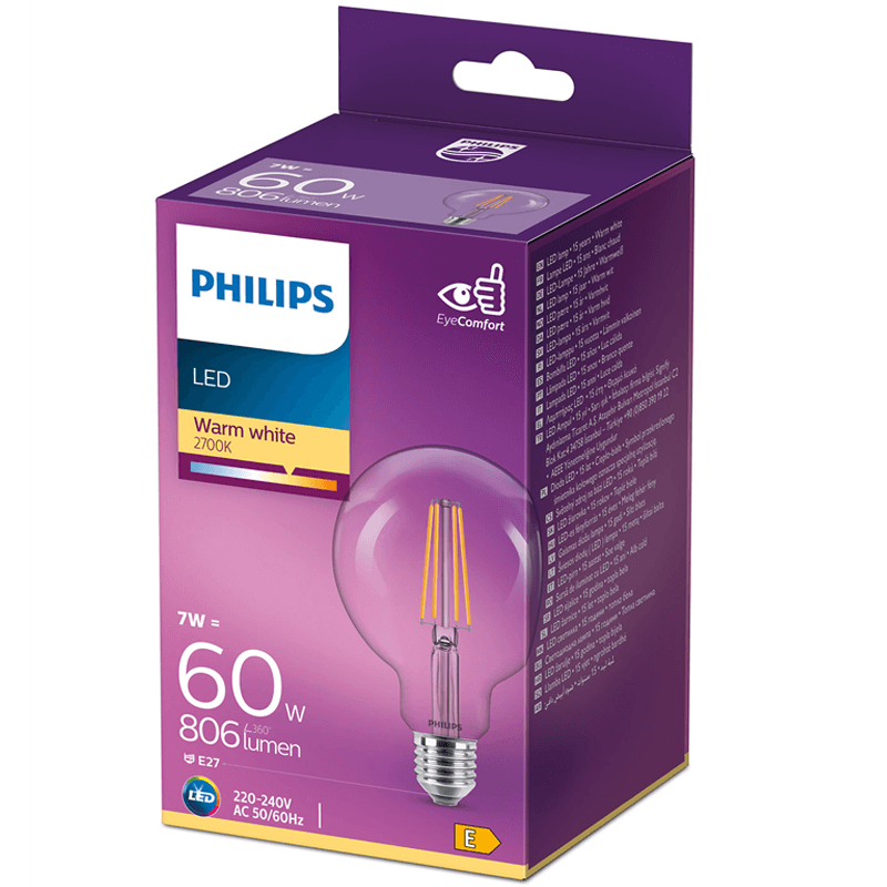 Lâmpada LED Globo G93 com LED de filamentoLâmpada com potência de 7W - 60W, intensidade de luz de 806Lm e tom de luz quente de 2700K , este modelo é feito de vidro transparente e o LED é de filamento, uma lâmpada LED perfeita para decorar e iluminar .