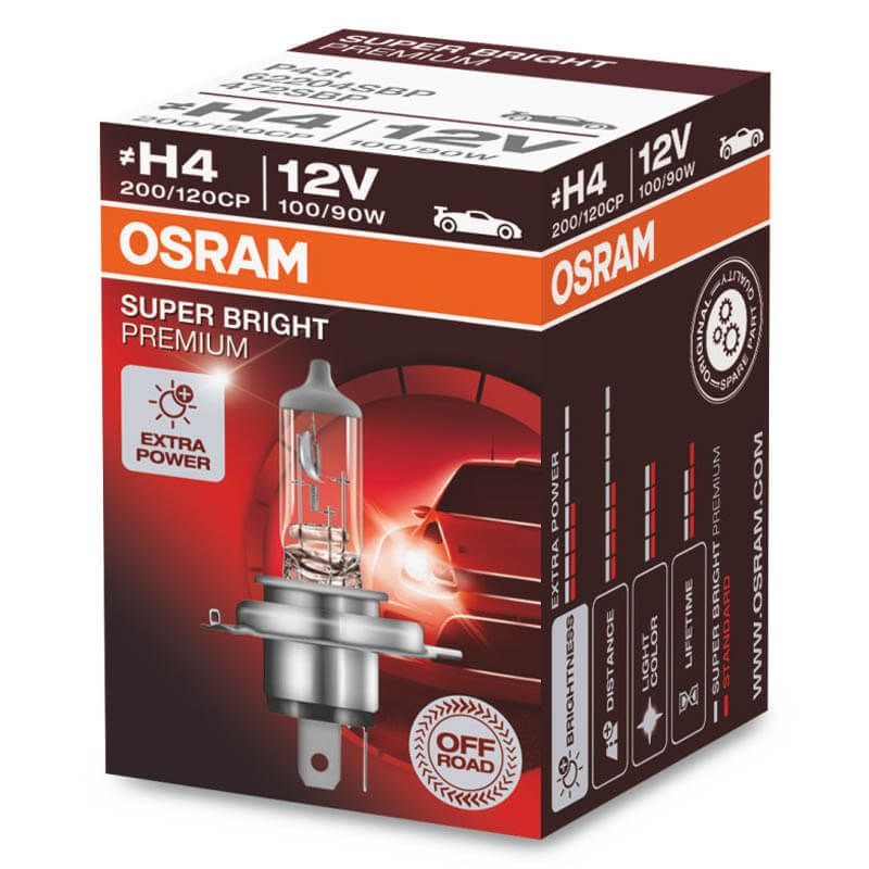 O Osram H4 Super Bright Premium Bulb é uma gama de lâmpadas Off-Road de alta potência, recomendadas para utilização em veículos todo-o-terreno. Este bulbo oferece uma vida útil de até 90 / 200 horas de utilização.