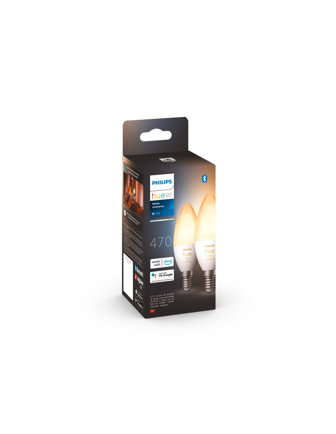 As duas lâmpadas de vela Philips E14 são reguláveis com o aplicativo e interruptor Hue, oferecem uma temperatura de cor variável de 2.200K a 6.500K por meio de 470 lúmens com potência máxima de 4W.