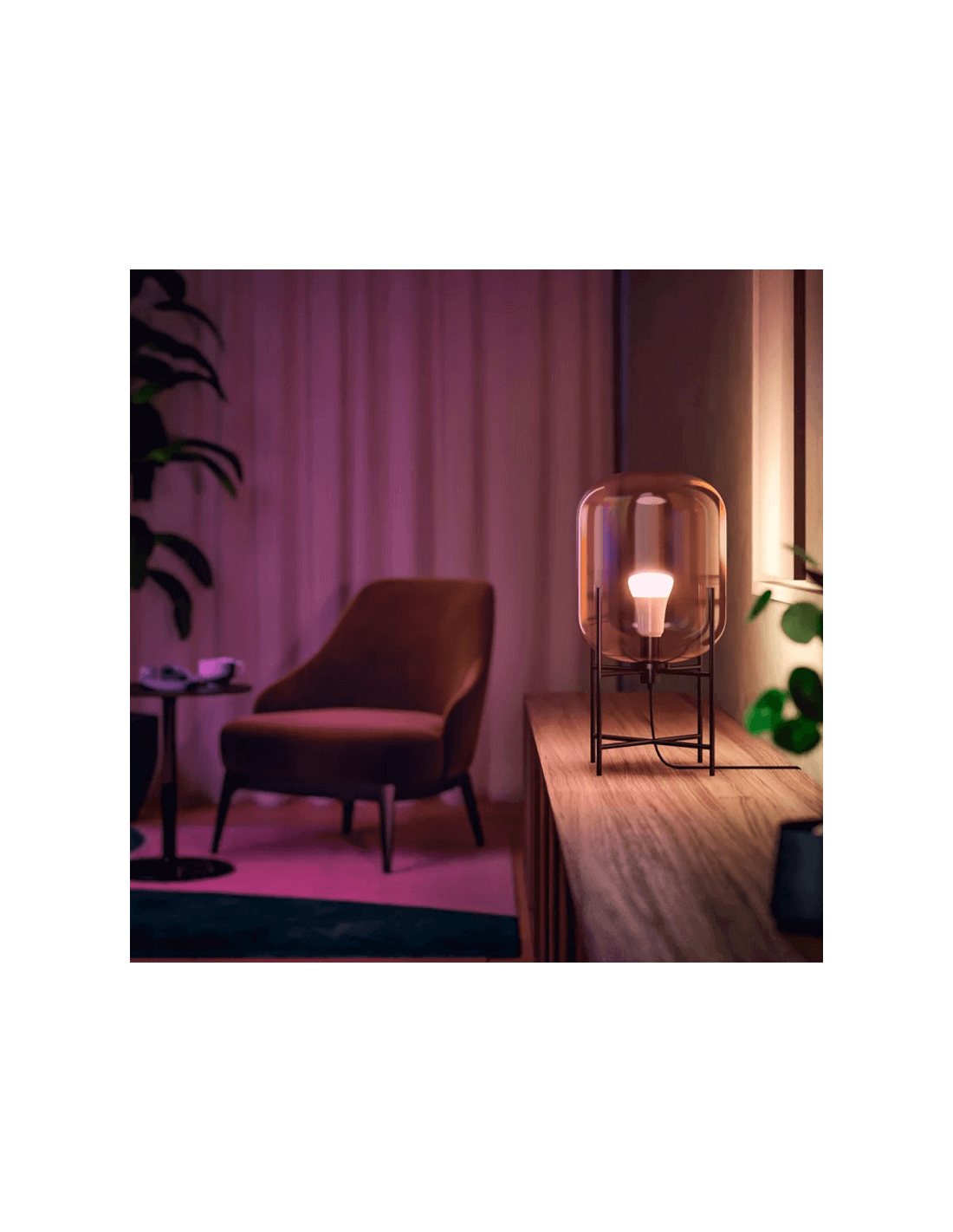 Cada lâmpada inteligente A60 mede 60 mm de diâmetro e 110 mm de altura. É regulável por meio do aplicativo Hue e interruptor . Oferece temperatura de cor variável de 2.000K - 6.500K e mais de 16 milhões de cores para criar a iluminação ambiente perfeita, com fluxo luminoso de 800 lumens e 6,5W de potência máxima.
