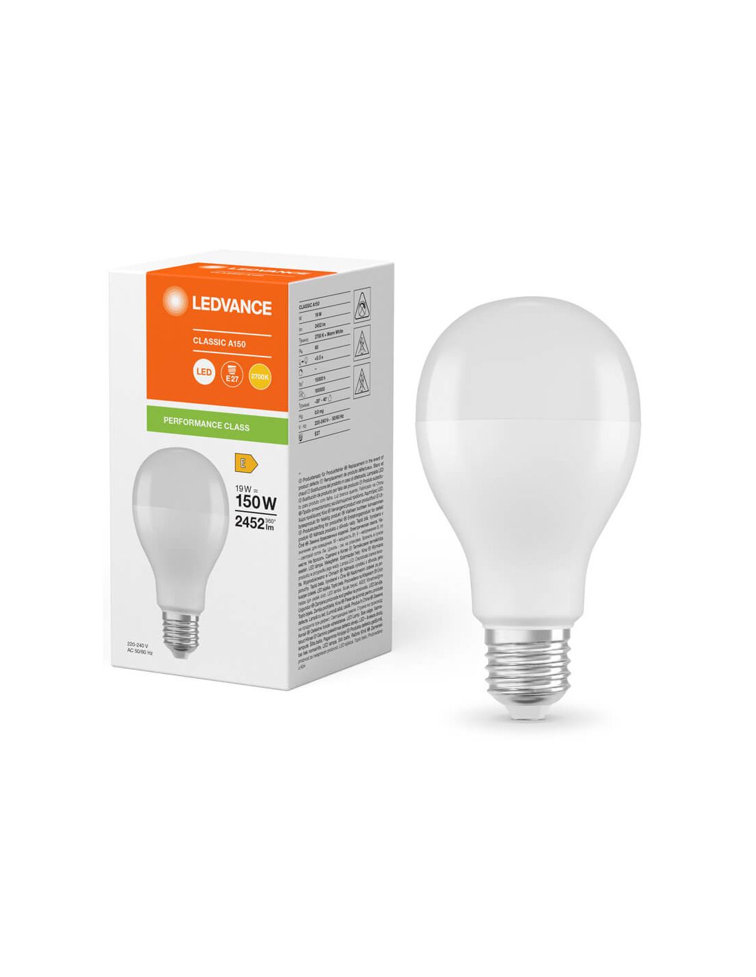 Lâmpada LED 19W da gama LedVance Performance Classe A 150 com rosca E27, formato A65, potência de 19w equivalente a 150w com intensidade luminosa de 2.452Lm e tonalidade luminosa de 2700K, luz quente).