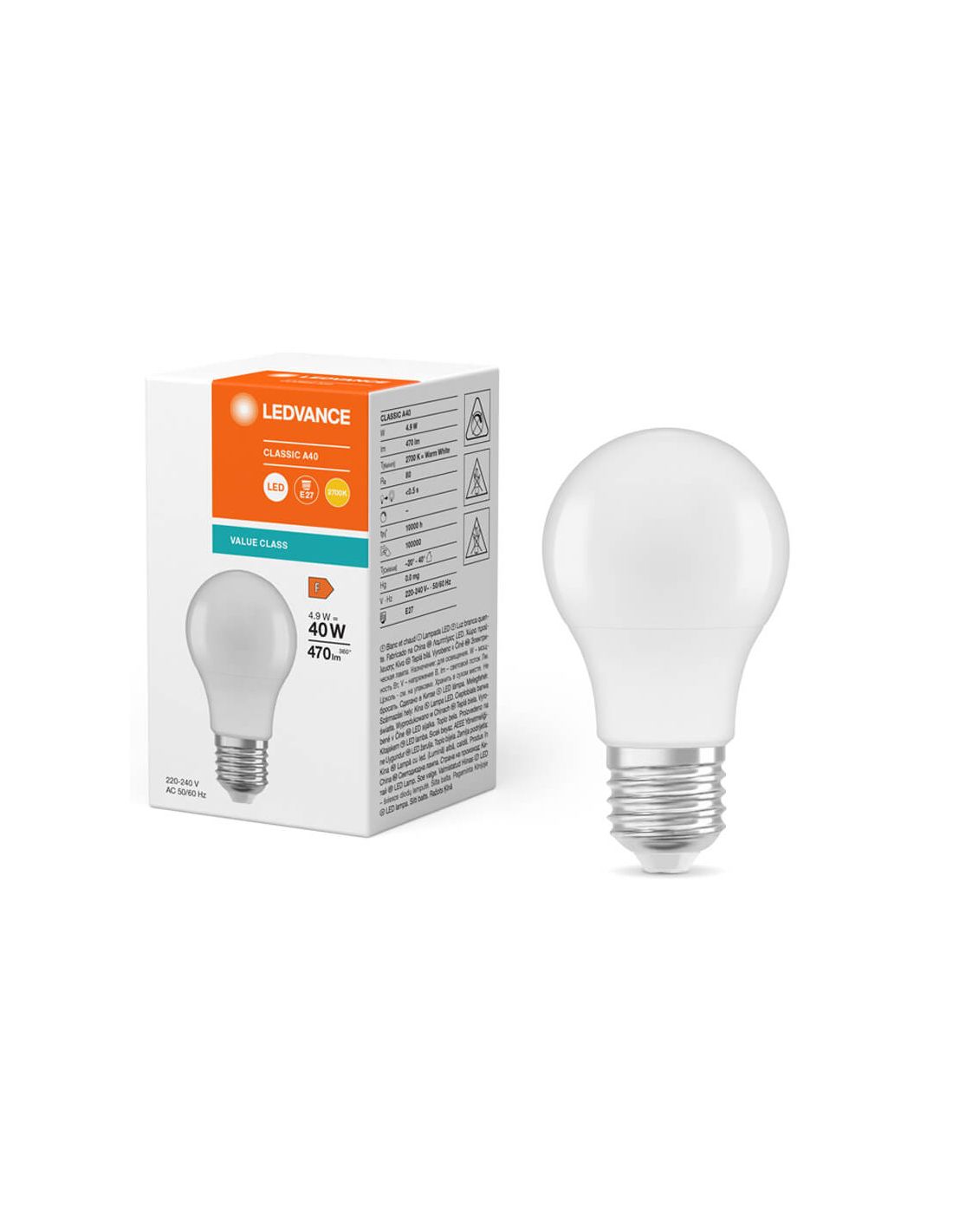 Lâmpada LED com parafuso formato E27 A60 da marca LedVance com potência de 4,9W equivalente a 40W de uma lâmpada incandescente que oferece uma intensidade luminosa de 470Lm. Esta Lâmpada Led é recomendada para cozinhas, banheiros, escritórios, estabelecimentos comerciais, restaurantes, supermercados e áreas onde seja necessária alta resolução de cores. Gama LedVance Value Class com vida útil de 10.000 horas, disponível em 3 tons de luz.