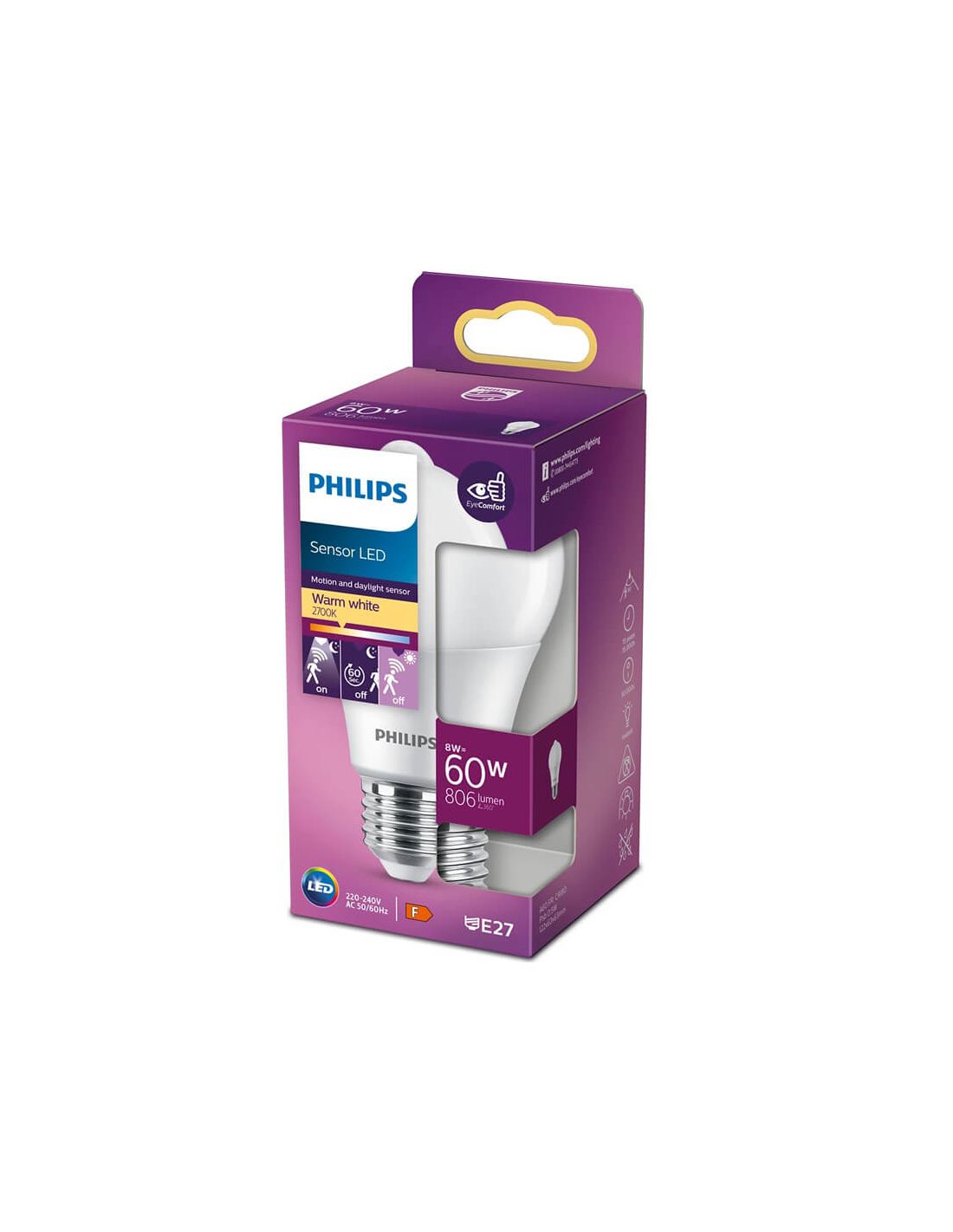 Lâmpada LED E27 com Sensor de Movimento com potência de 8W equivalente a 60W de uma incandescente convencional e intensidade de 806Lm . Tem vida útil de 15.000 horas e a Philips oferece garantia de 2 anos .