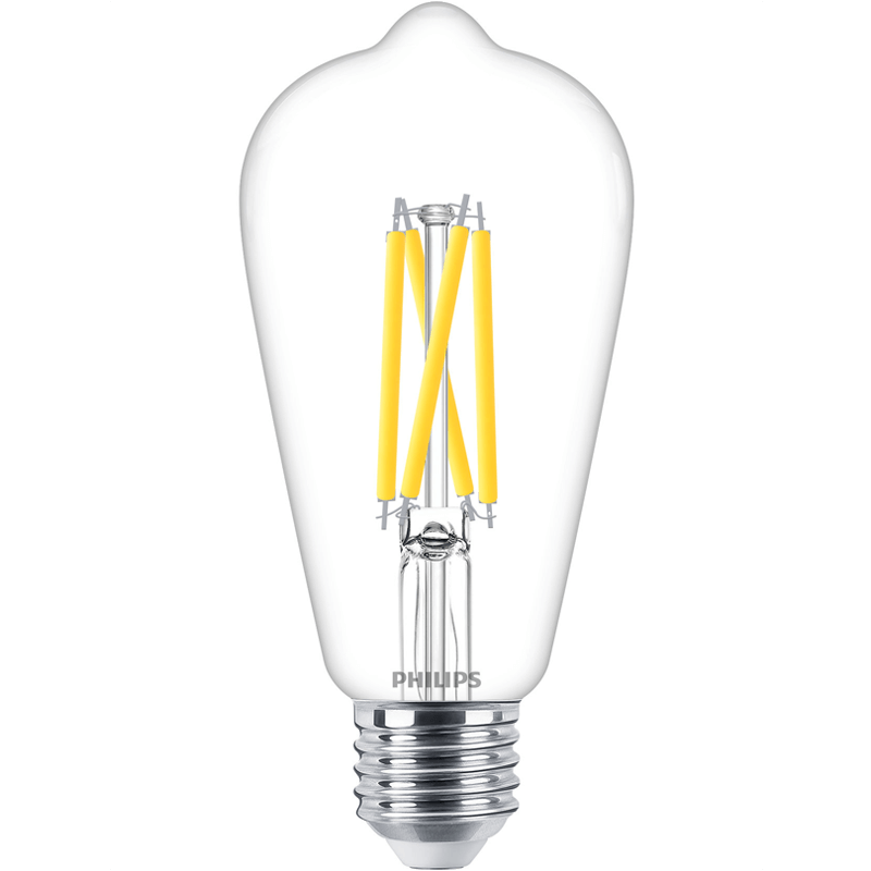 Lâmpada LED de filamento Edison ST64 com potência de 5,9W equivalente a 60W e intensidade de luz ajustável de 806Lm, este modelo de lâmpada possui WarmGlow que permite regular a intensidade da luz por meio de um regulador externo e ao mesmo tempo que é regulado a intensidade da luz o tom da luz varia entre 2.200K e 2.700K, quanto maior a intensidade da luz, o tom da luz fica menos amarelo e quanto menor a intensidade, o tom da luz fica mais amarelo, 2.200K.