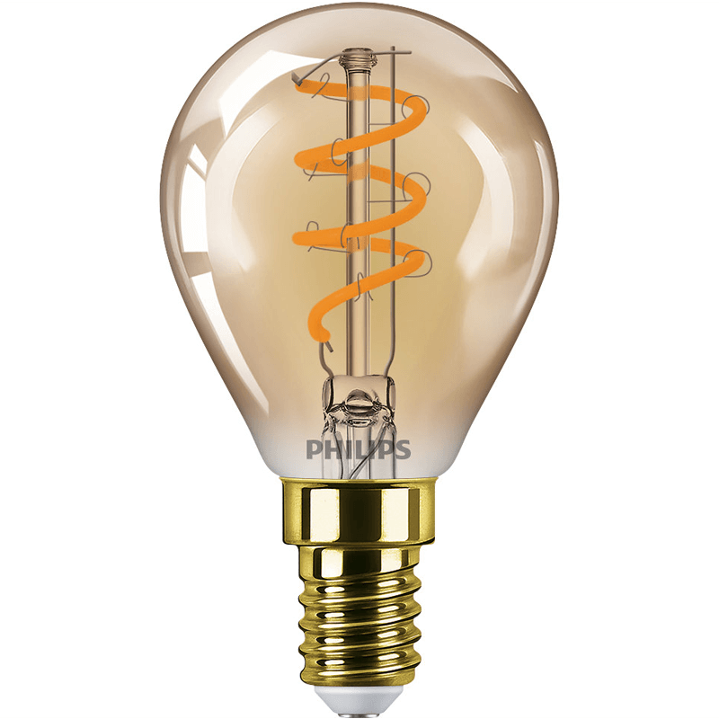 Lâmpada LED dourada P45 de vidro dourado com fio estreito E14 com uma potência de 2,5W equivalente a uma lâmpada incandescente convencional de 15W, a sua intensidade luminosa é de 136Lm e pode ser regulada por um regulador externo, (não incluído). O tom de luz desta lâmpada LED é 1.800K, um tom de luz muito quente.