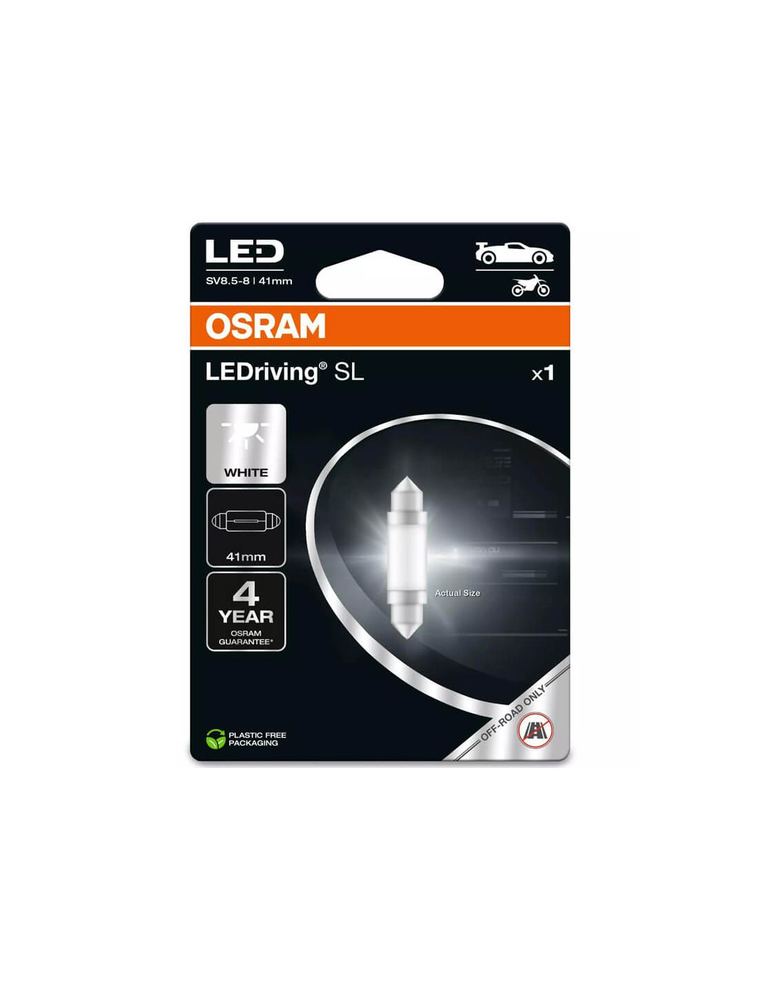 A lâmpada LED Osram LEDriving SL C5W de 41 mm é uma lâmpada LED tipo festão projetada para substituir as lâmpadas halógenas tradicionais, oferecendo uma iluminação mais branca, moderna e eficiente.