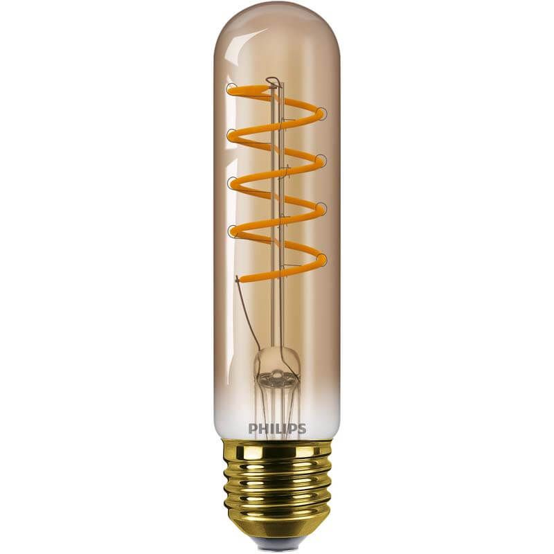 Lâmpada LED vintage com acabamento Gold e filamento tubular T32 com potência de 4W equivalente a uma lâmpada incandescente de 25W, com intensidade ajustável de 250Lm e tom de luz quente de 1.800K. Esta lâmpada pertence à linha Philips Vintage LED.